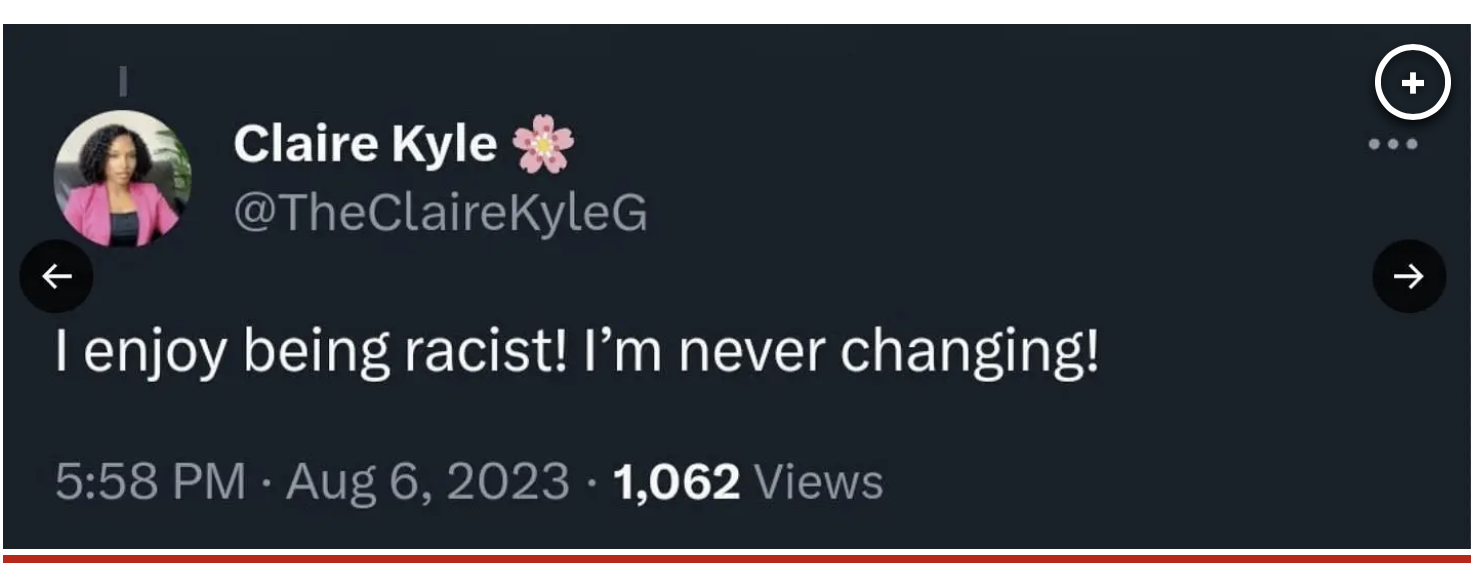 It included tweets saying she was a proud racist, that she is a black supremacist, and immune from losing her job for her tweets.