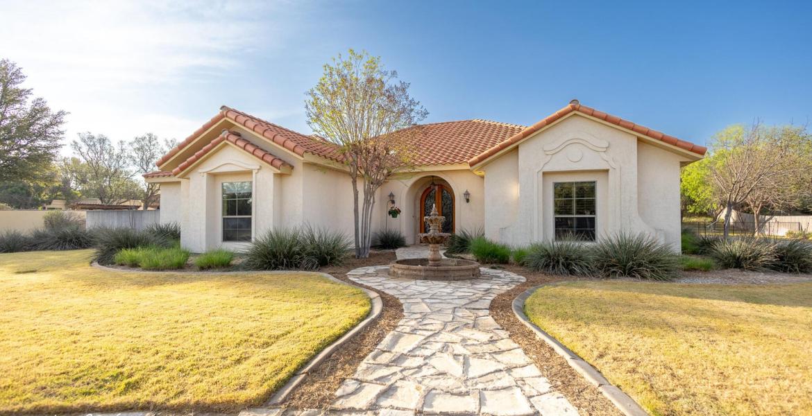 Absolutely beautiful custom Spanish-style home built by Chad Decker offering 2,968 sq ft, 4 bedrooms, and 2.5 baths plus an exercise room conveniently located next to the primary suite. Stunning curb appeal with stucco exterior, Spanish concrete tile roof, limestone porch columns and fireplace and a charming front fountain. Inside, you'll find high-end custom finishes throughout, including a gorgeous kitchen with Talavera tile accents and a custom hood over the gas range. The outdoor living is just as impressive with a wood-burning fireplace—perfect for relaxing evenings. A private water well supports the beautifully landscaped .7-acre lot. Energy-efficient spray foam insulation adds comfort and savings. Enjoy easy access to the community park and proximity to San Angelo Country Club golf course. A true dream home!