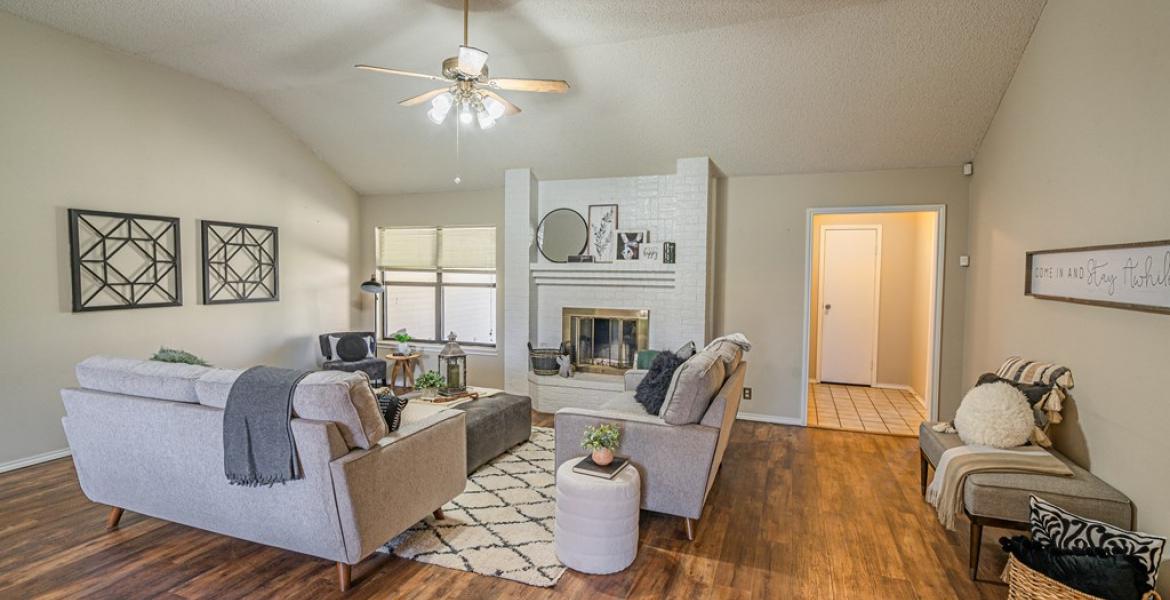 This is a great 4 bedroom home located on a wide street with established, mature trees. Walk right into the entryway and then into the large living room with vaulted ceiling, wood laminate floors, and a fireplace. Located right off the living room is the breakfast nook and kitchen providing an open concept. This floorpan is perfect with split bedrooms and a 4th bedroom that also has a room off of it that could work as an office, playroom, or whatever your needs are! You'll love the great patio and backyard, large laundry room and room for updates to make it your own!