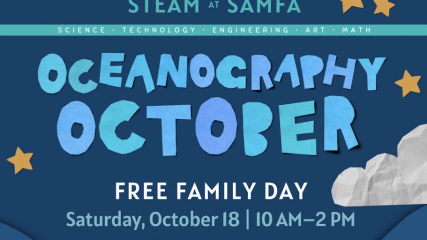 STEAM at SAMFA: A Family Day Adventure presents Oceanography October featuring educational art and science experiences for all ages. Bring your family and friends for activities including: Moving Fish – create a fish that moves its body, Turtle or Crab - which is your favorite, Under the Sea – create your own scene from the ocean, and build 3D animal models. Families can also plant seeds in biodegradable pots. Be sure to visit the Concho Clay Studio for clay activities and enjoy the bouncy house in the breezeway. Activities may be substituted, and bonus activities may occur.