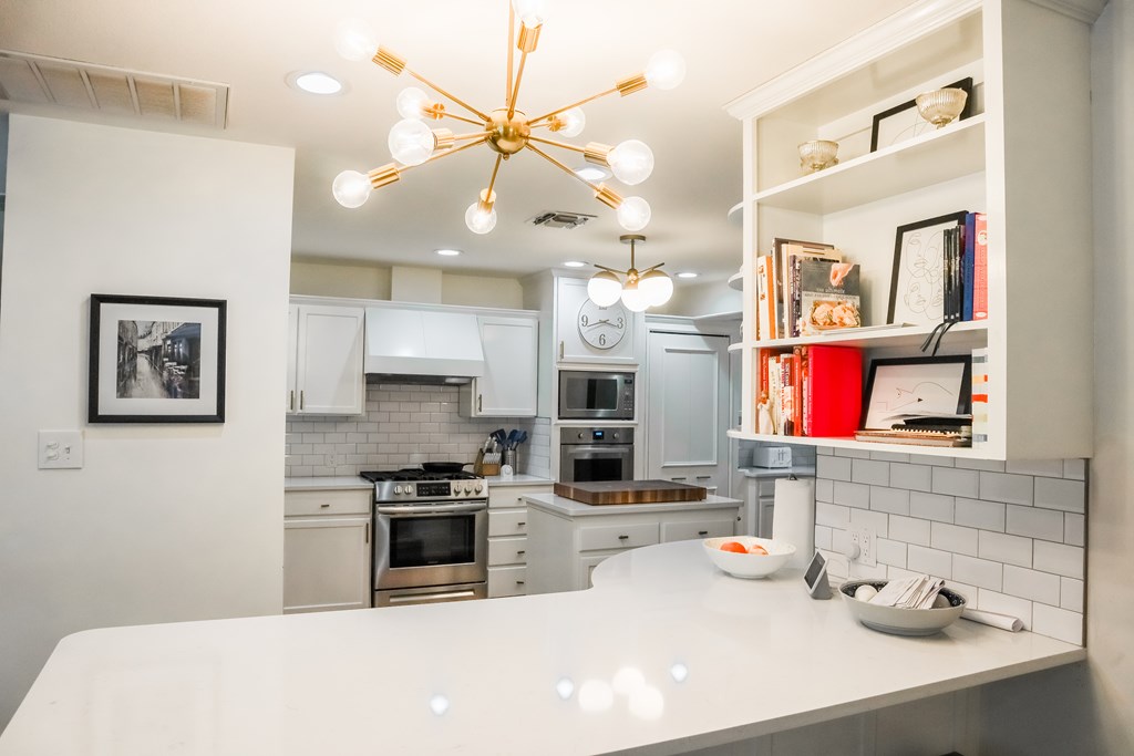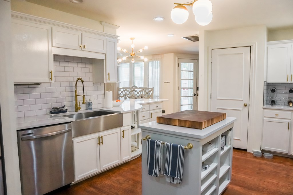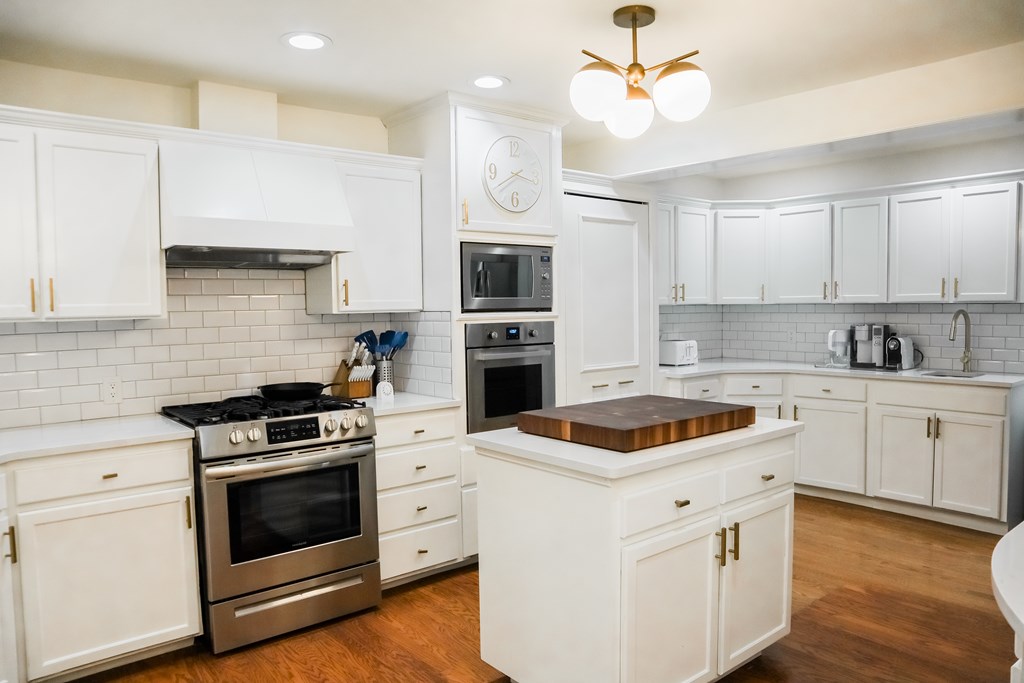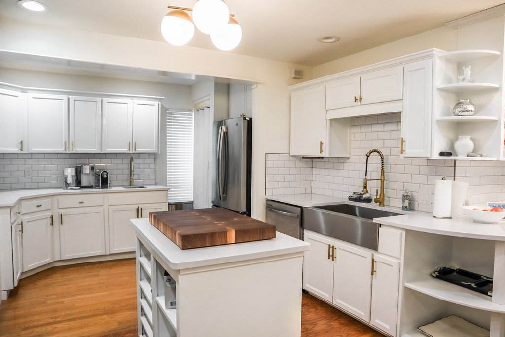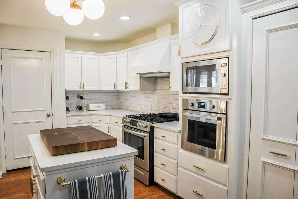 The home was built in 1965 but has been completely updated. The kitchen has double ovens, a gas range, a bar sink and extra deep stainless farmhouse sink, beveled subway tile backsplash tile, and quartz countertops!