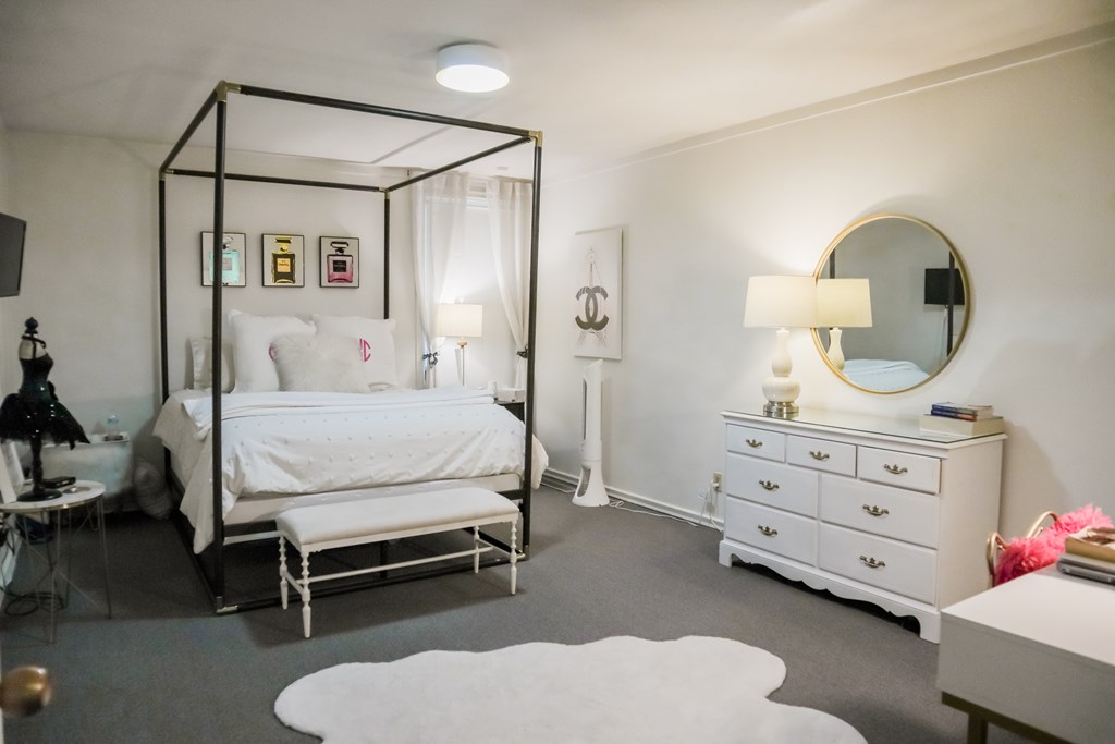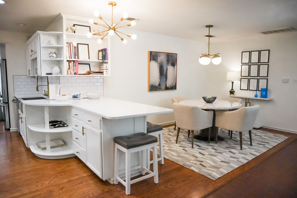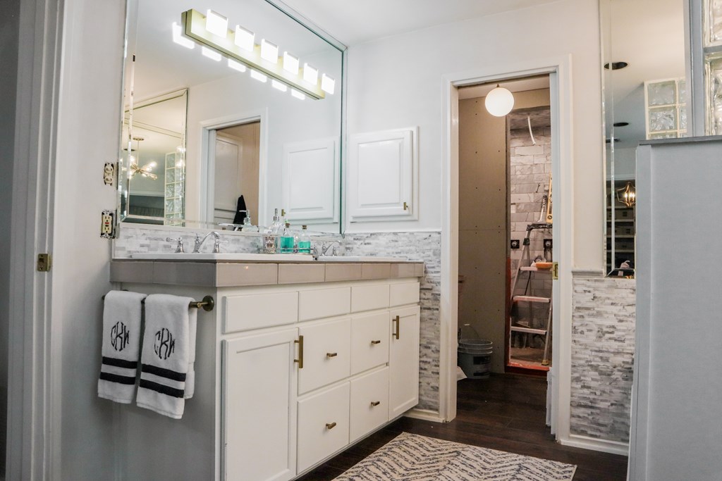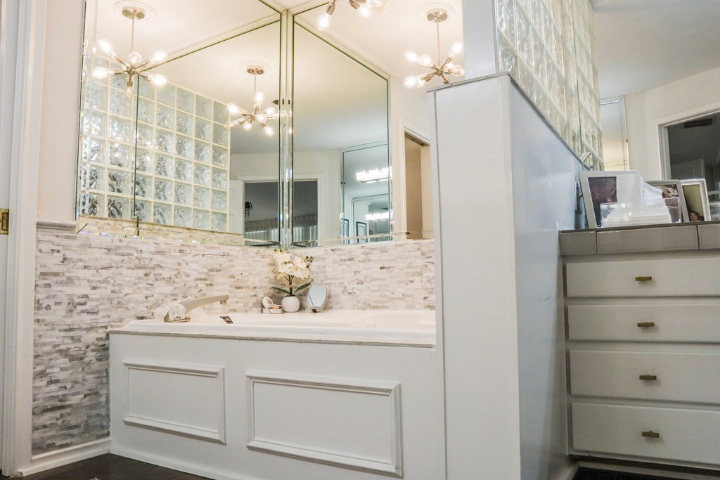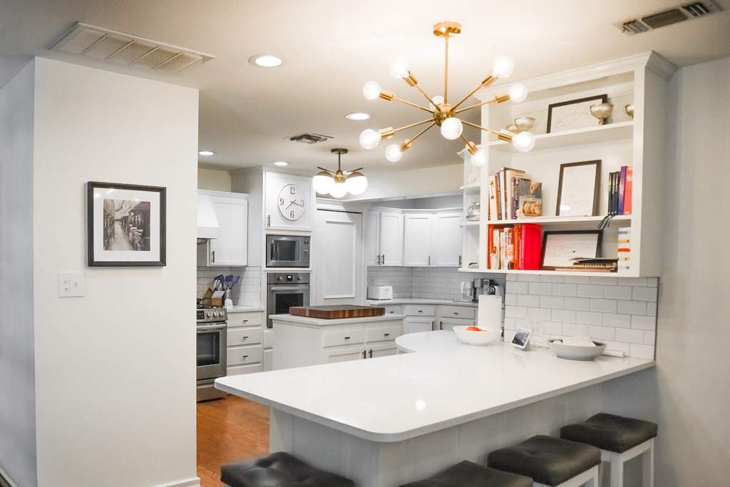 The home was built in 1965 but has been completely updated. The kitchen has double ovens, a gas range, a bar sink and extra deep stainless farmhouse sink, beveled subway tile backsplash tile, and quartz countertops!