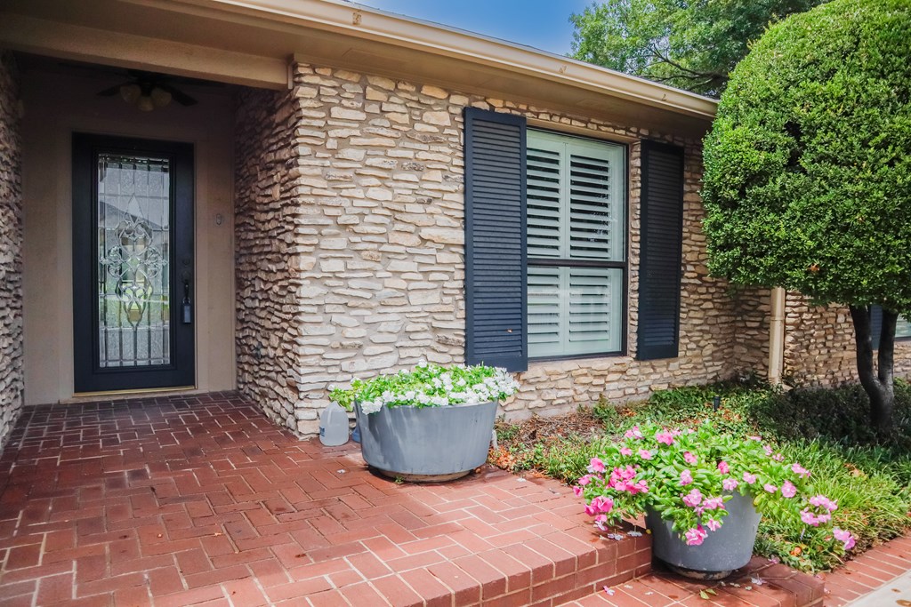 Lovely stacked stone and stucco exterior with a metal roof installed approx. 7 years ago with turbine and solar panel to pull heat from the attic. Front yard is fenced with wrought iron fence and has a dog door for easy access for your furry friend.