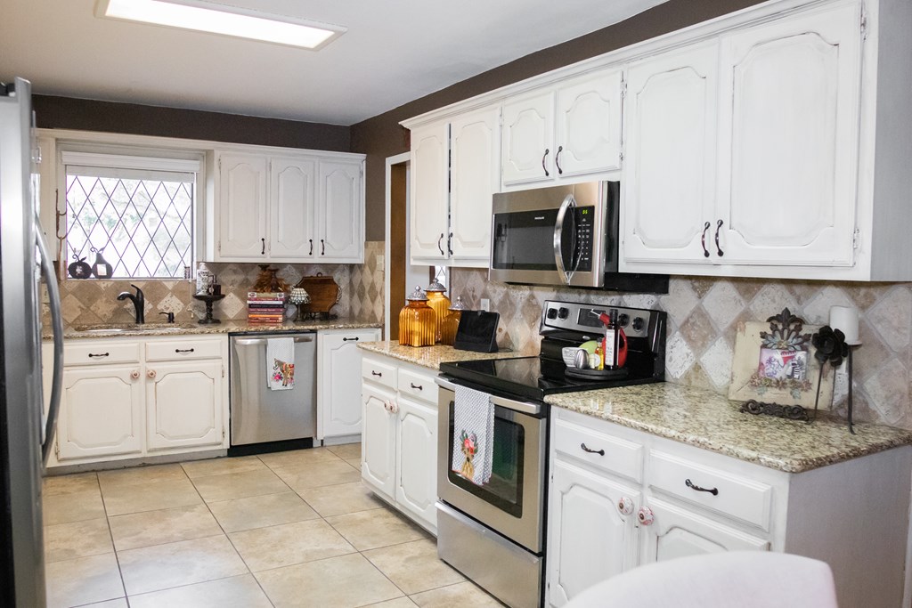 Mature shade trees and landscaping greet you as you walk up the the lovely Tudor-style home with lovely leaded glass windows.  Large, flexible living spaces offer opportunities for entertaining. Beautiful hardwood floors and tile throughout living areas.  Kitchen has abundant cabinet space and pretty granite counter tops.  Large laundry area with sink and extra storage space. Recently updated and spacious master bedroom and spa-style bath and guest bedroom and bath are downstairs, 2 additional bedrooms and bath upstairs.