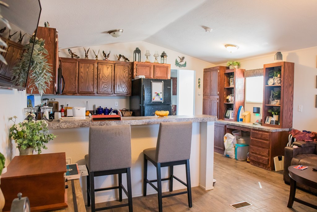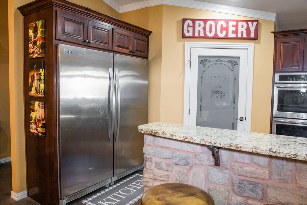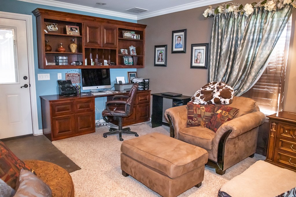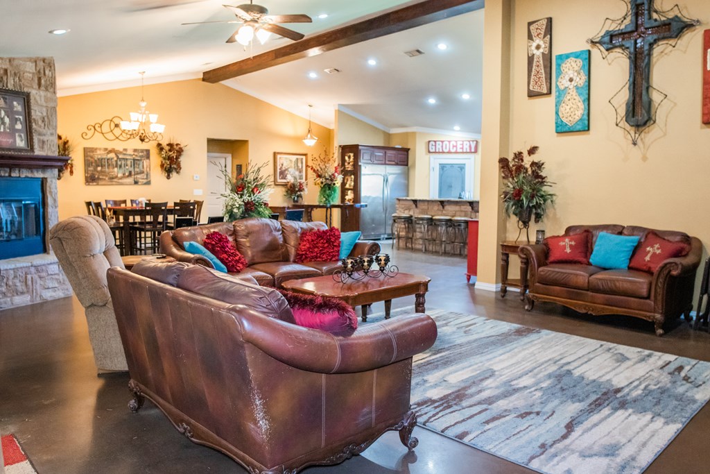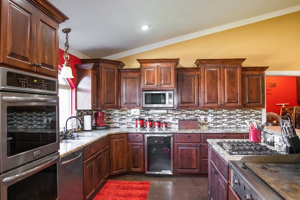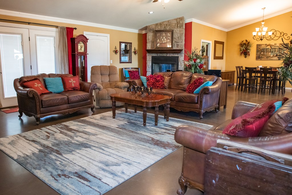 This beautiful home has a Lovely open floor plan with large gas cooktop and griddle, plus large living area, beautiful fireplace, and a man cave/den with bar.