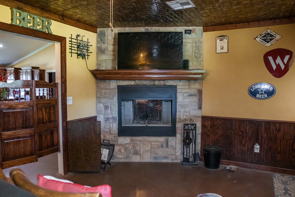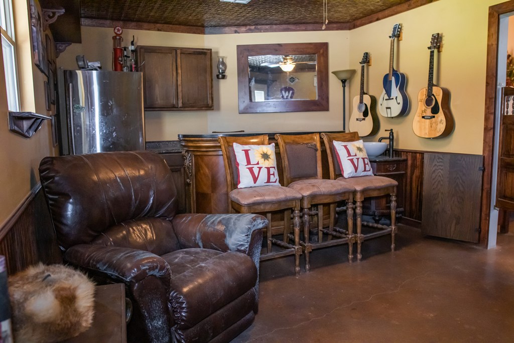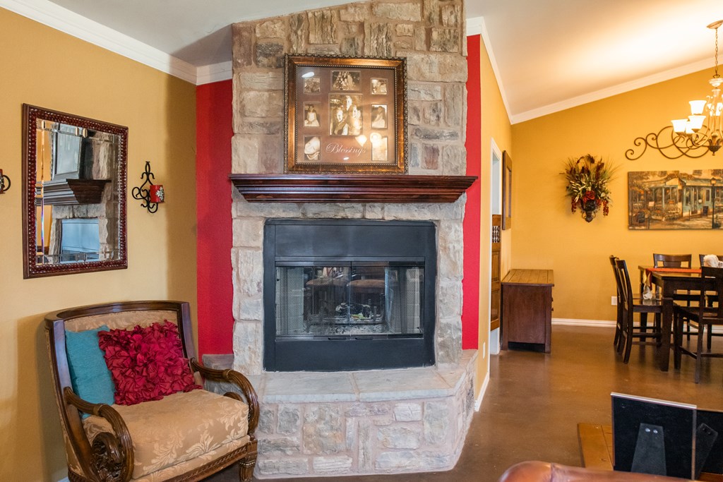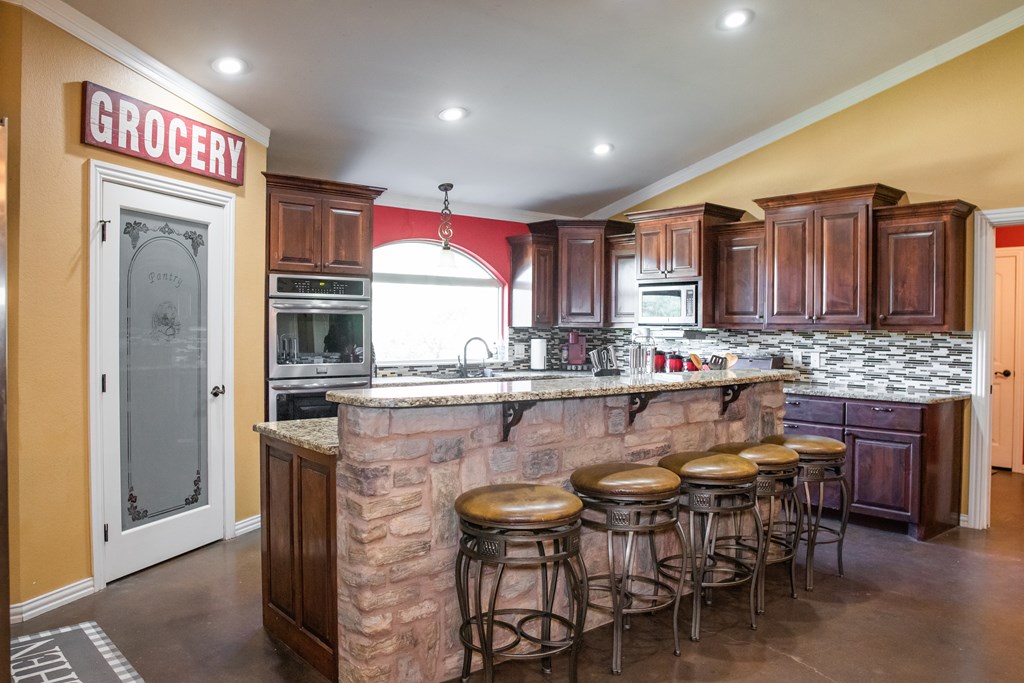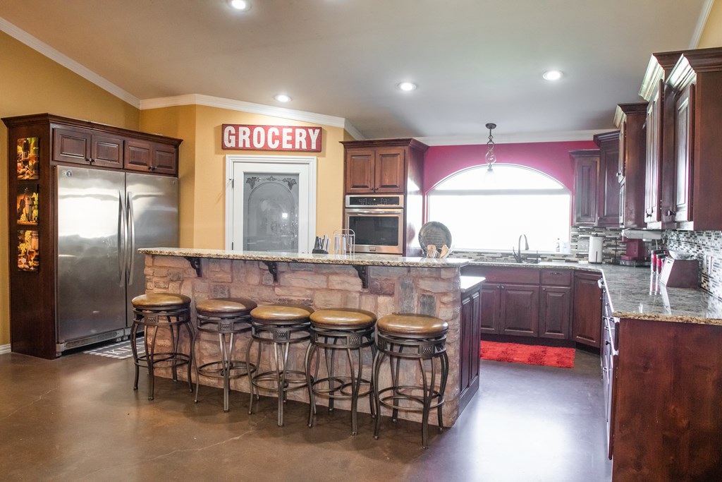 This beautiful home has a Lovely open floor plan with large gas cooktop and griddle, plus a large living area, beautiful fireplace, and a man cave/den with bar.