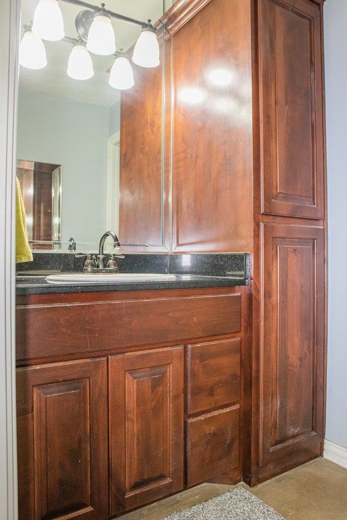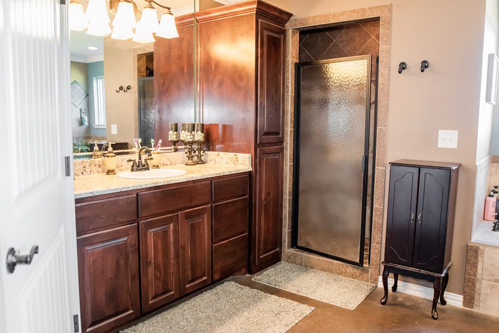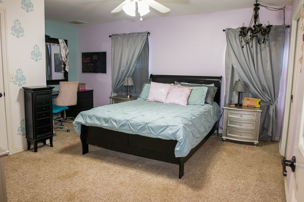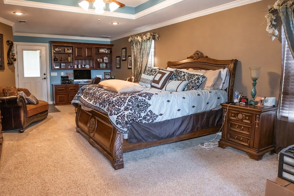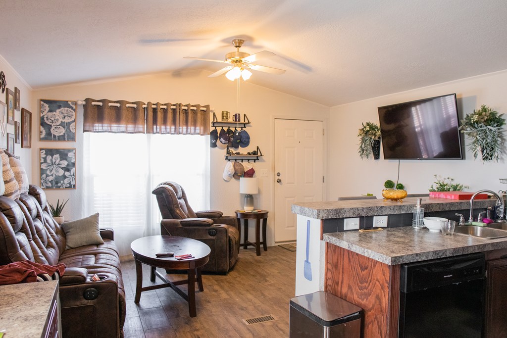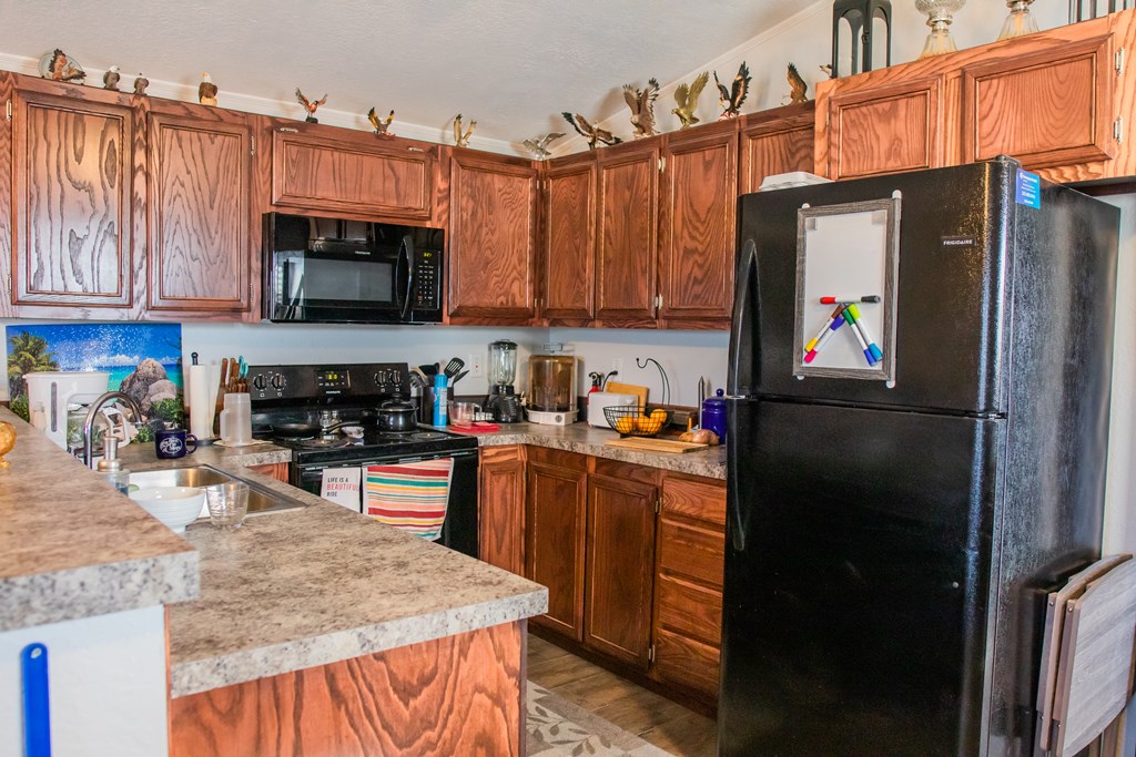 This beautiful home has a Lovely open floor plan with large gas cooktop and griddle, plus a large living area, beautiful fireplace, and a man cave/den with bar.