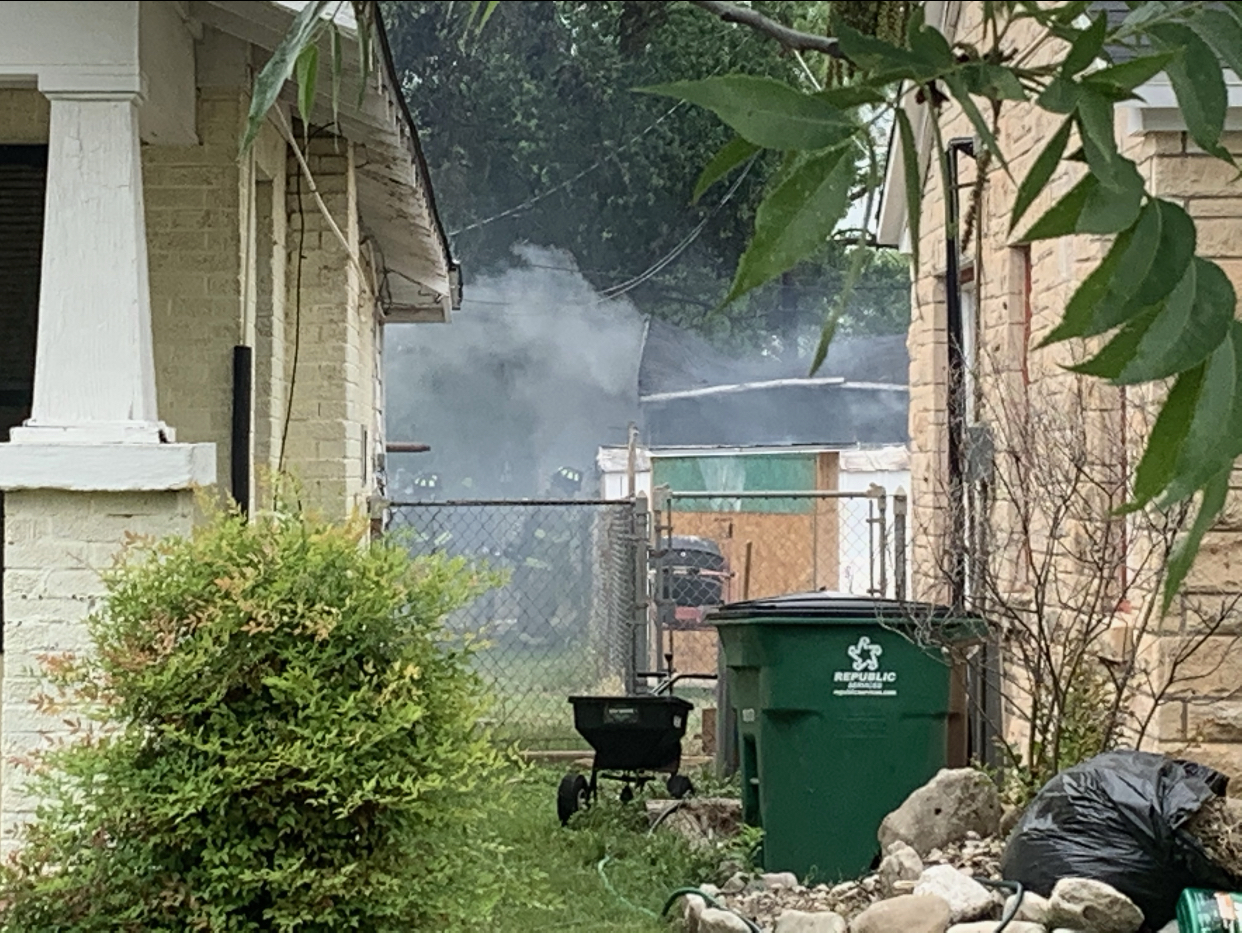 Smoke could be seen billowing out of the wooden structure in the back yard of the residence.