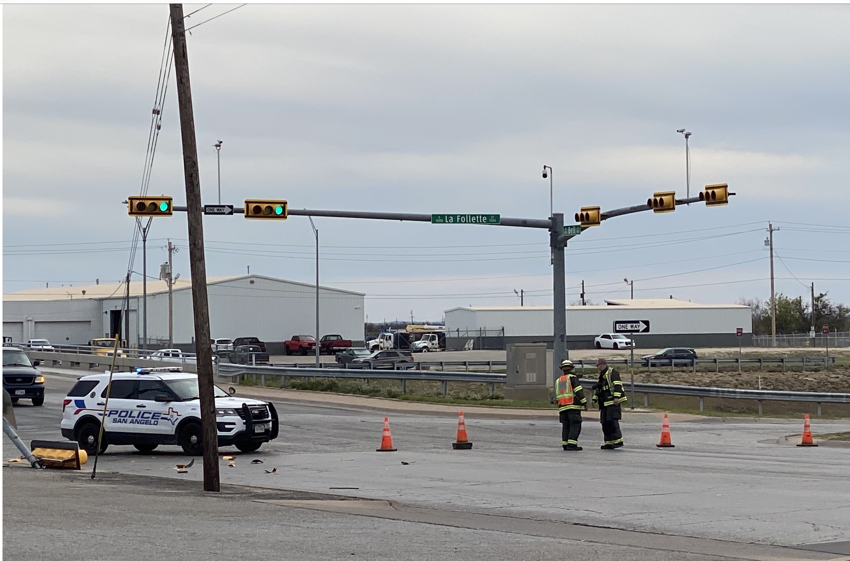 SAN ANGELO – A bizarre crash on Bell St. Tuesday afternoon took out a signal light and power lines when a bobtail truck with the bed raised hit them and the driver apparently fled the scene.