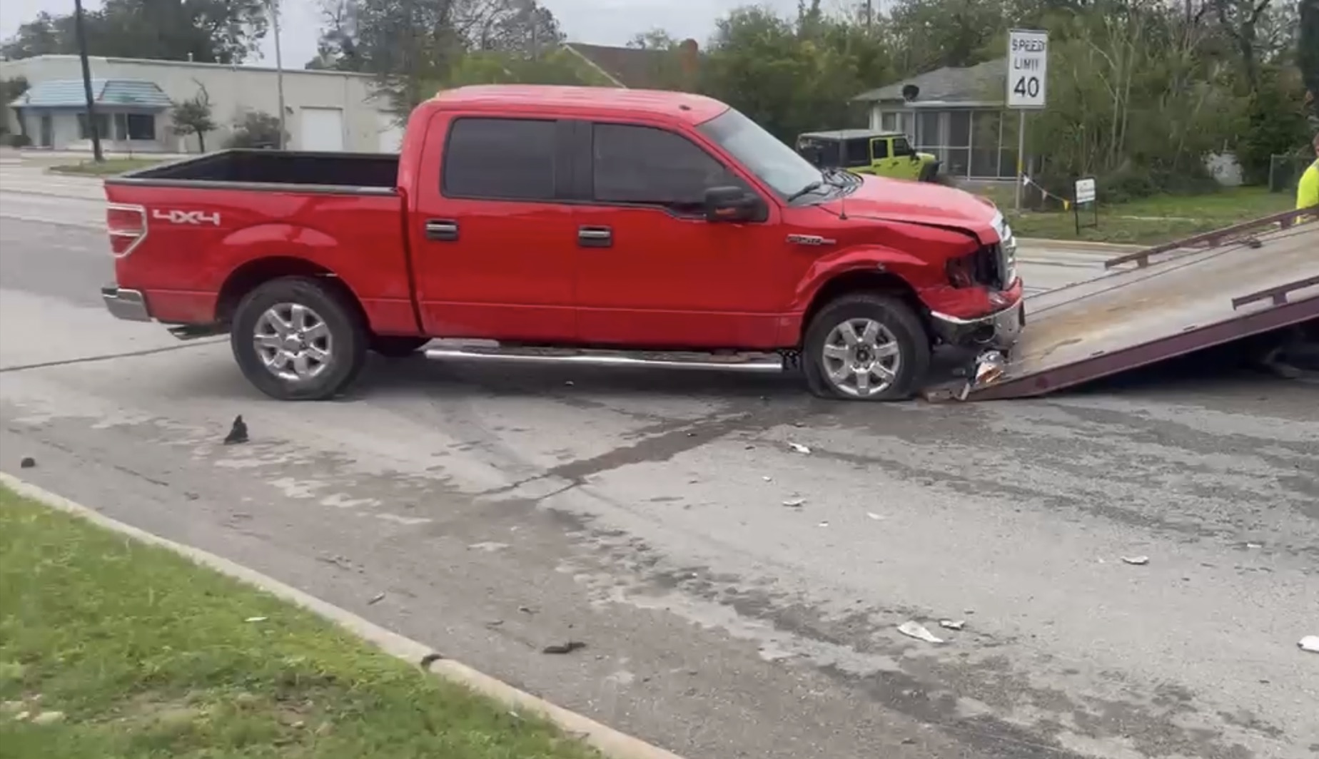 The vehicles in question involved a red F-150 and a gray Kia Forte which were both headed south bound. According to the San Angelo Police Department officer on the scene, a witness said that the Kia Forte made an unsafe lane change and side swiped the Ford truck. After they collided, both vehicles spun around and then came to a stop, sending debris scattered throughout the street.