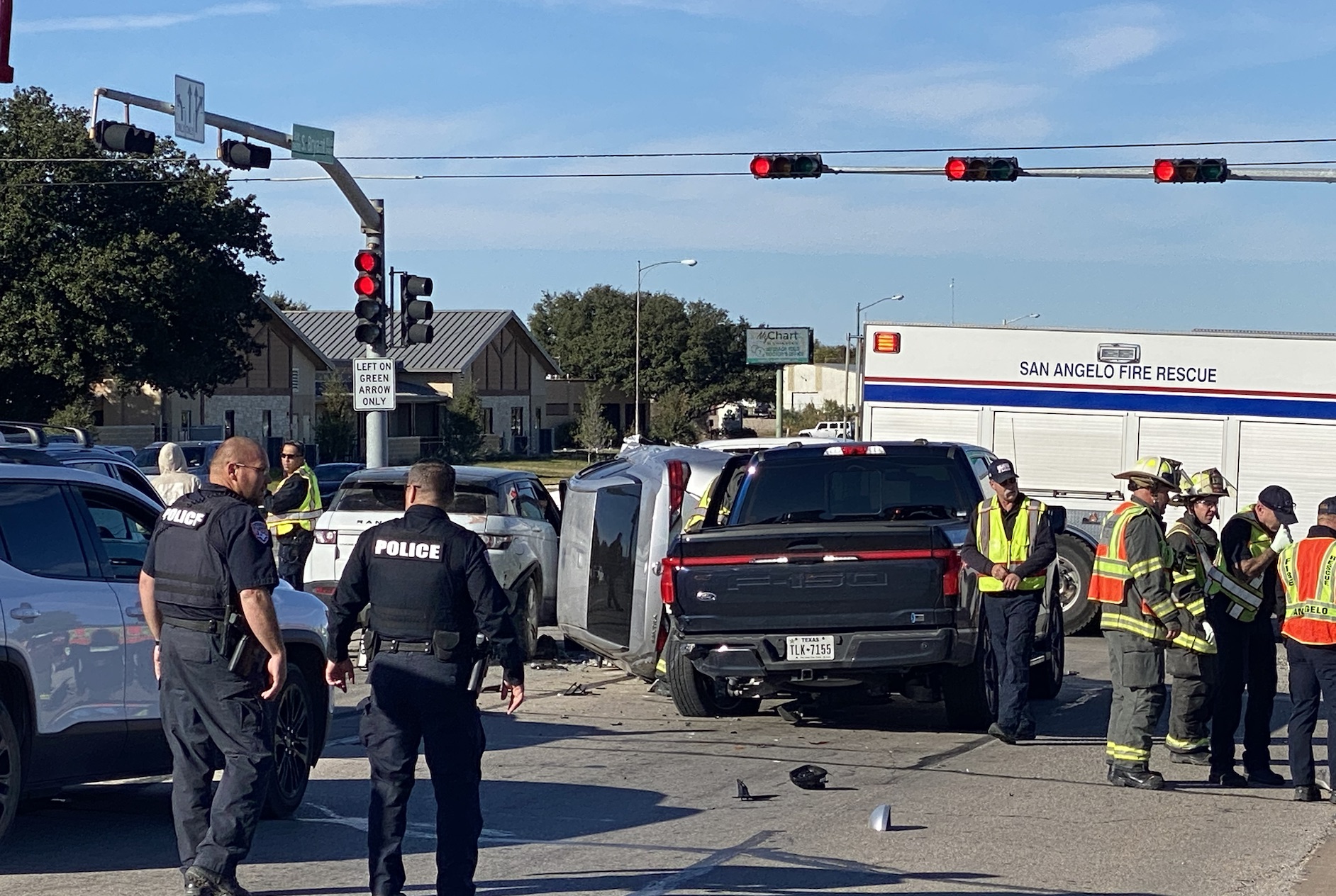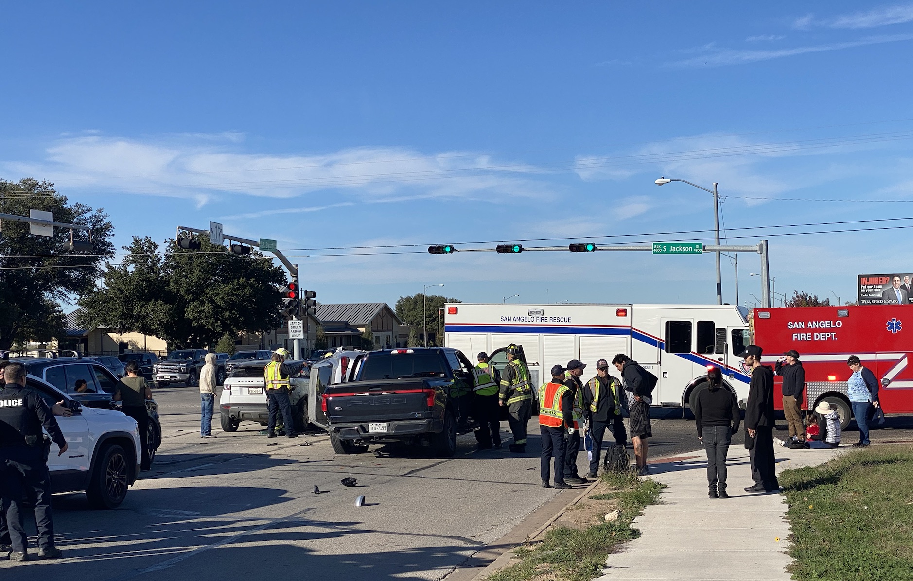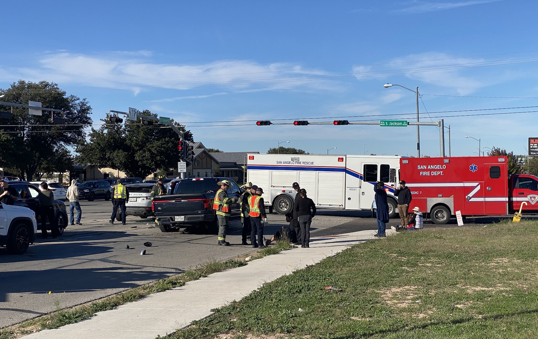 Law enforcement worked the scene and shut down three lanes of northbound traffic and the right turn onto South Jackson Street. The San Angelo Fire Department cleaned up debris and tow trucks arrived to remove the vehicles involved. The Kia Telluride was able to drive off. A white GMC Acadia was thought to be involved but wasn’t.