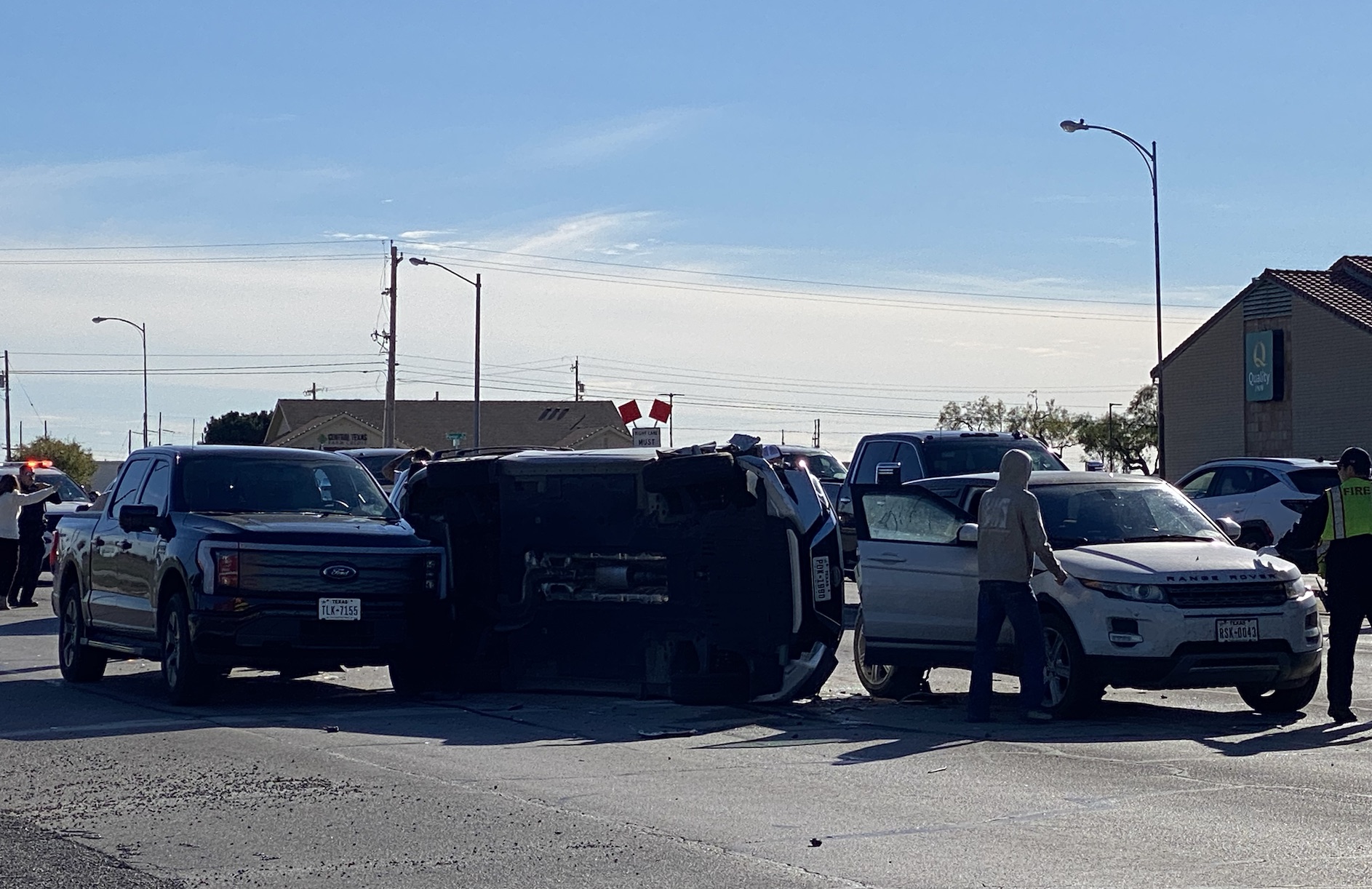 At about 2:50 p.m., San Angelo Police responded to the intersection of South Bryant Boulevard and South Jackson Street for reports of a major crash where an individual was trapped inside a vehicle. Once on scene, a silver Nissan Altima was flipped on the driver’s side and was stuck between a black Ford F-150 and a white Range Rover. A dark colored Kia Telluride was also struck by the Altima.