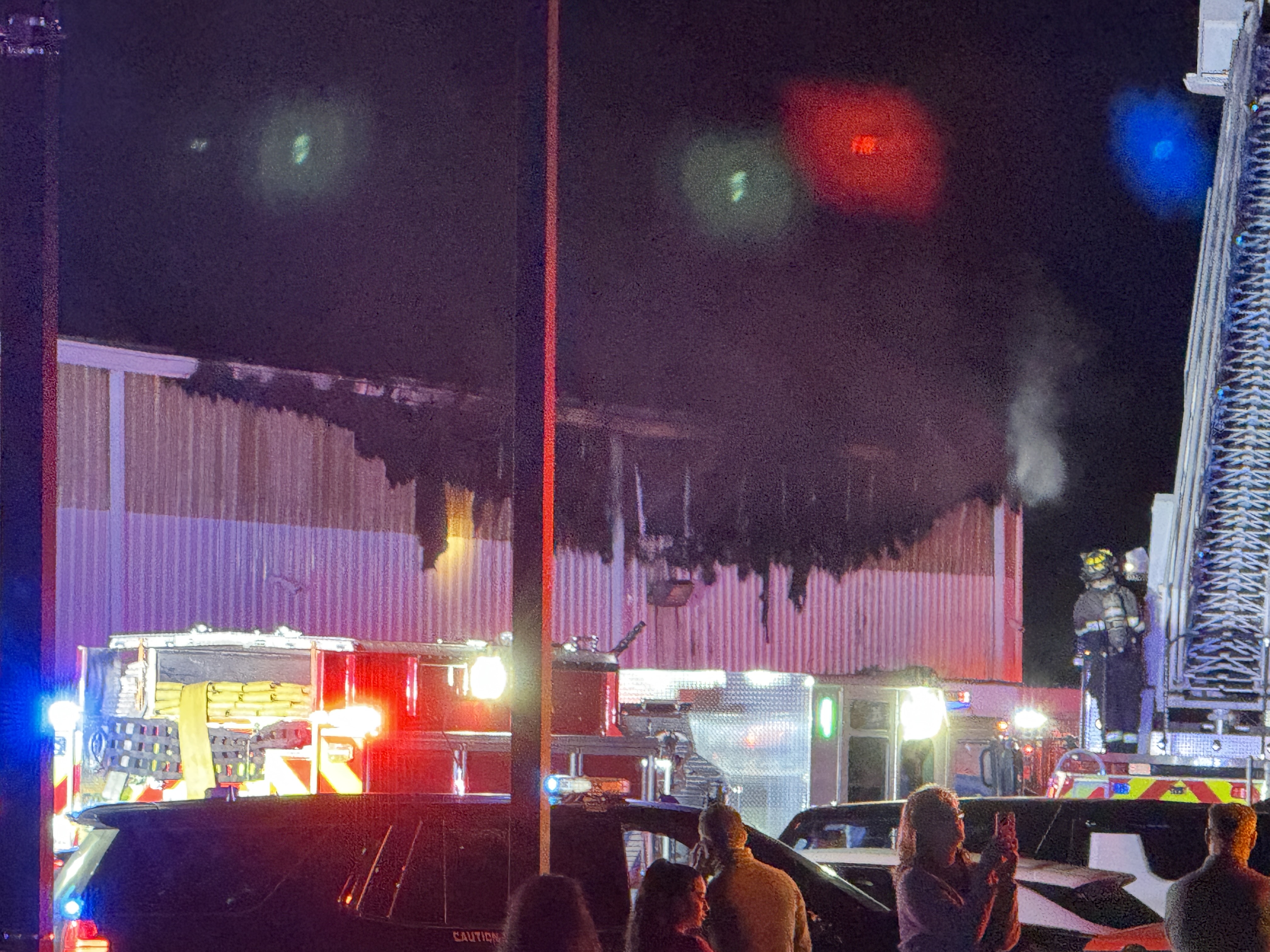 The fire, which started on the ground level of the shop, burned through fiberglass panels, creating visible exterior damage. Brody said that these panels are flammable and provide ventilation for the fire. The exact cause of the blaze remains under investigation, with the fire marshal’s office on-site to determine the source of ignition.