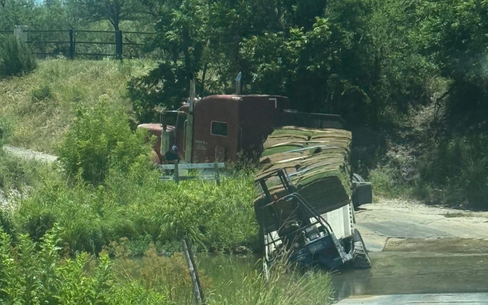 DOVE CREEK, TX — A truck hauling sod veered off a rural low-water crossing Friday afternoon, prompting authorities to close the lanes on River Crossing Road in Dove Creek, according to the Tom Green County Sheriff’s Office.