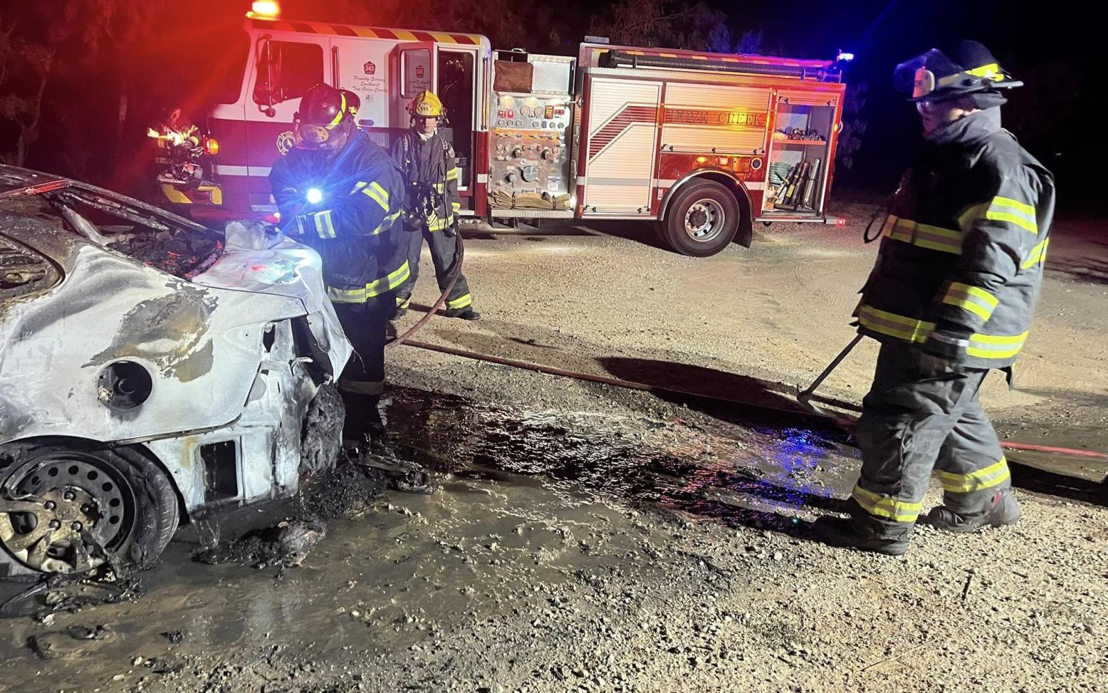 No injuries were reported, and the fire did not spread to the home, though the car was destroyed.