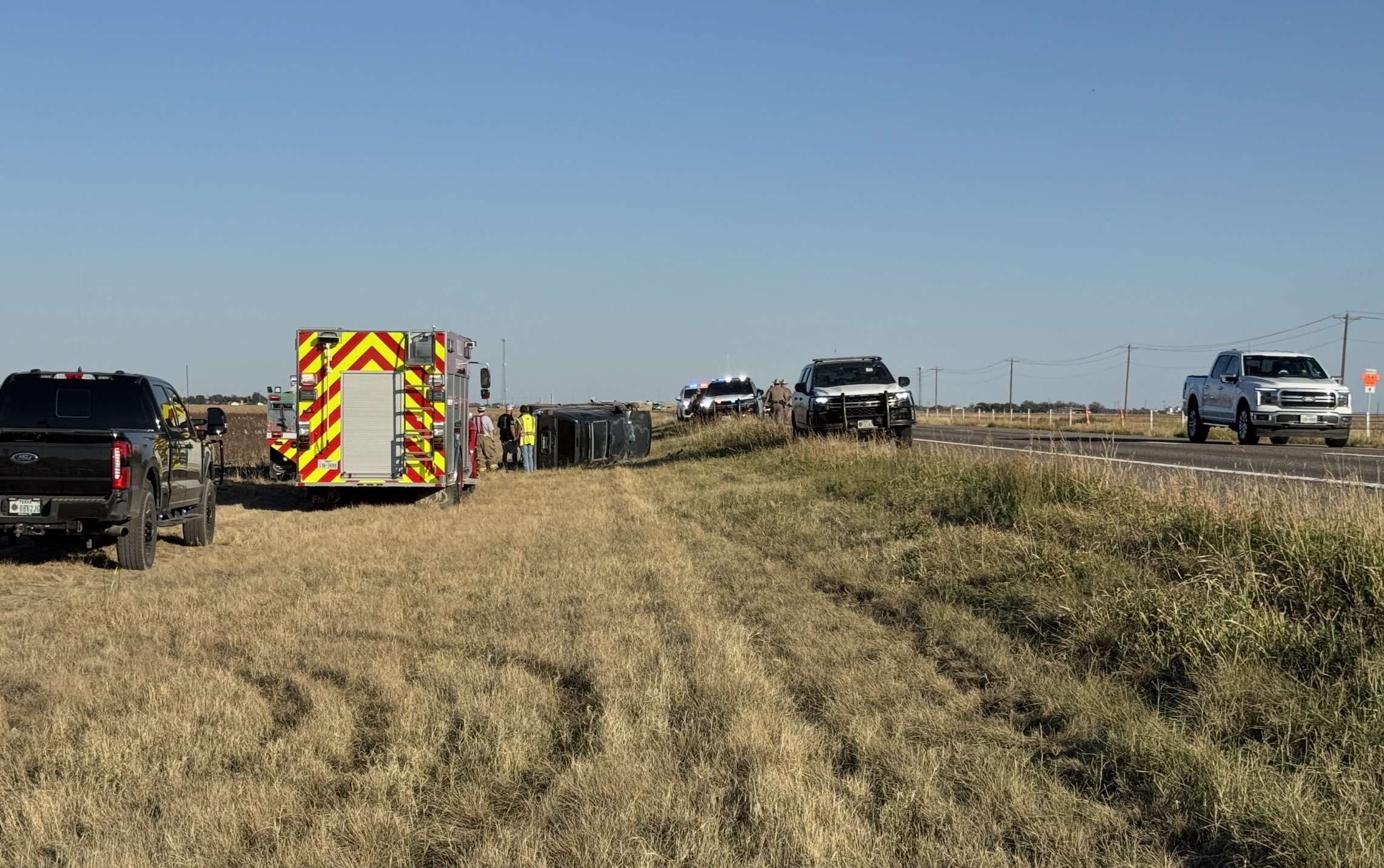 The crash was reported at about 3:40 p.m. Wall Volunteer Fire Department, San Angelo Fire Department, Texas DPS, and the Tom Green County Sheriff’s Office responded and found the vehicle overturned off the roadway. No entrapments were reported.