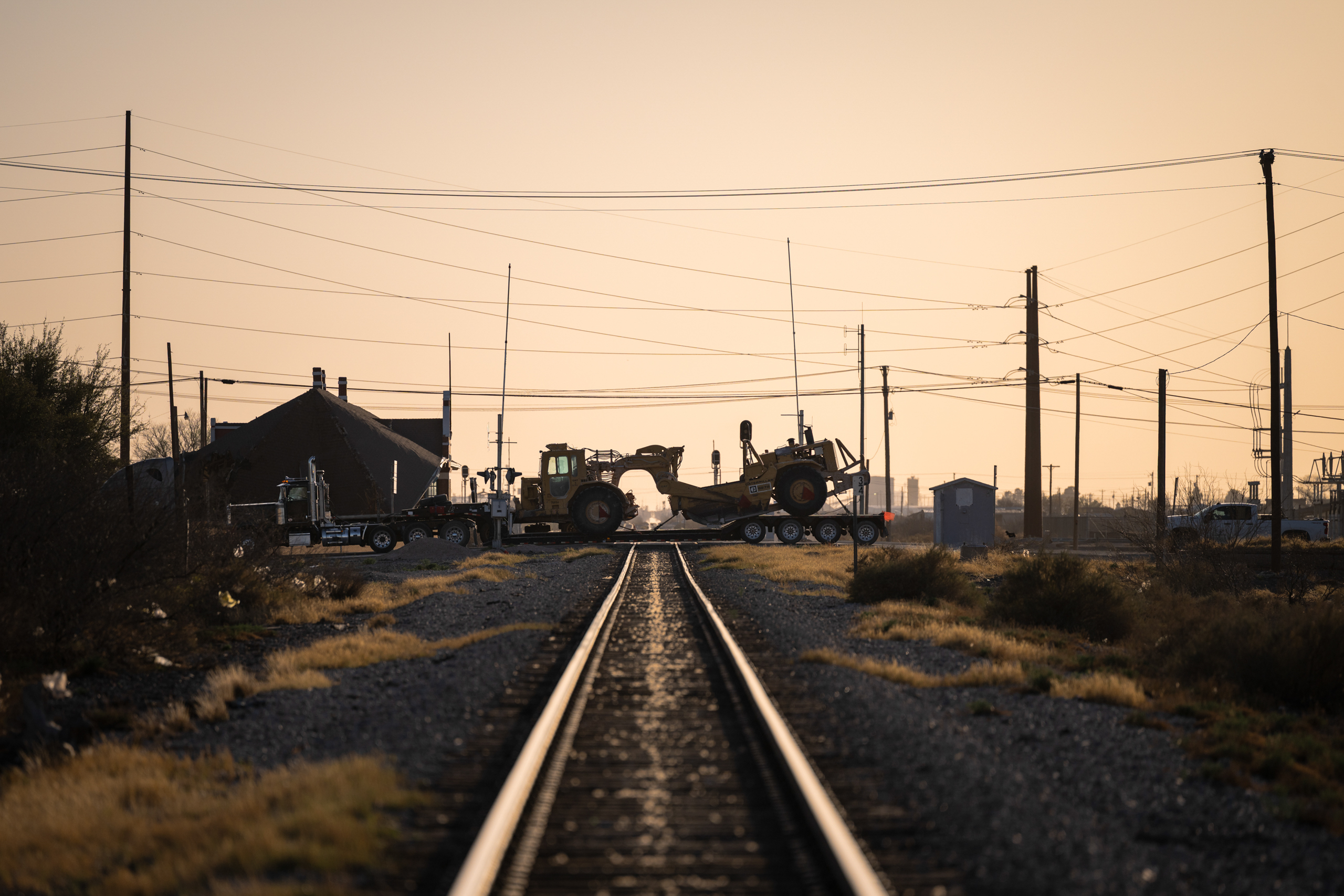 A lowboy truck hauling a piece of heavy machinery crosses over the U.S. Highway 285 railroad crossing on March 21.