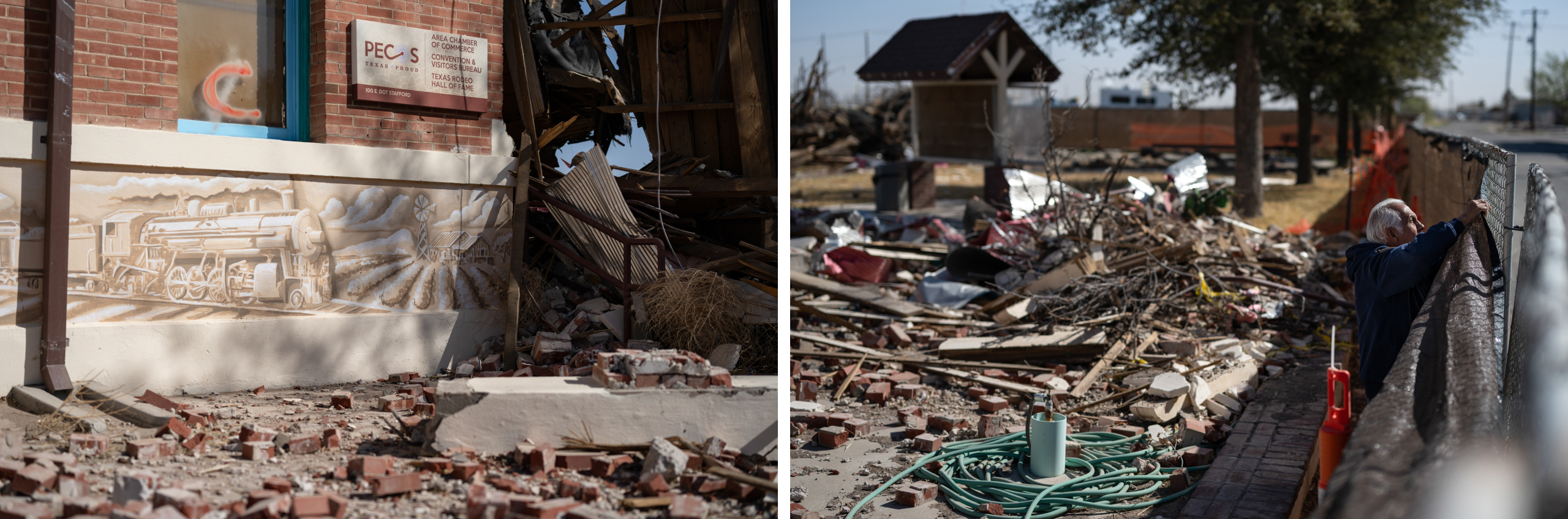 Left: A mural on the side of the destroyed Pecos Chamber of Commerce building on March 21. Right: Frank Carrasco, a maintenance worker for the West of the Pecos Museum, hangs tarp on chainlink fence to block the view of the destroyed commerce building from plain view.