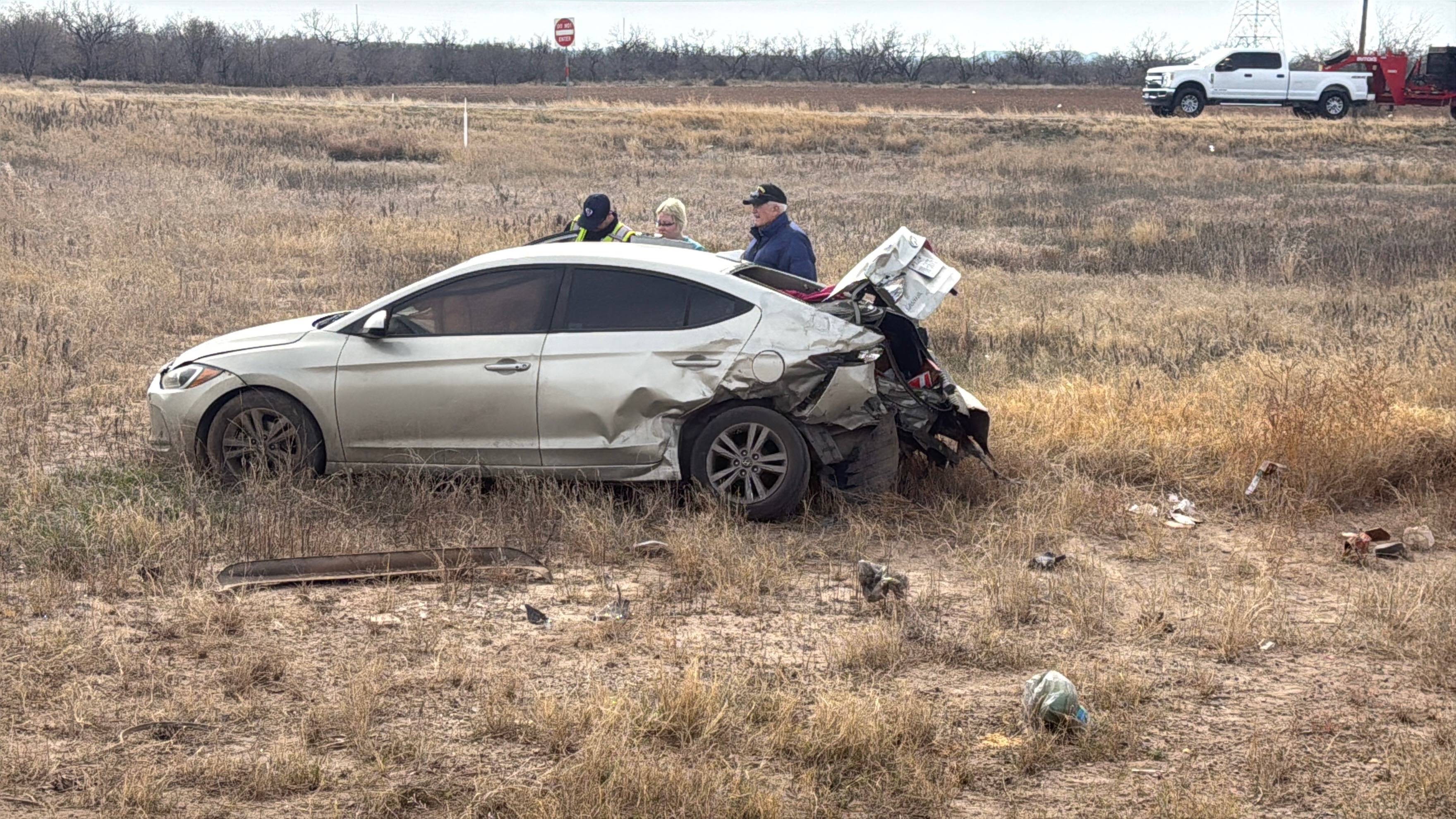 The crash occurred about 1:15 p.m. near the intersection of US 87 and March Road when a red Dodge Ram pickup ran into the back of a tan Hyundai car, causing extensive rear-end damage.