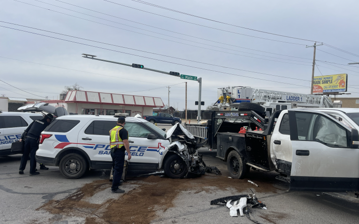 A crash between a San Angelo Police cruiser and a Ford F350 occurred at the Main St. and Pulliam intersection, resulting in a citation for the pickup driver.