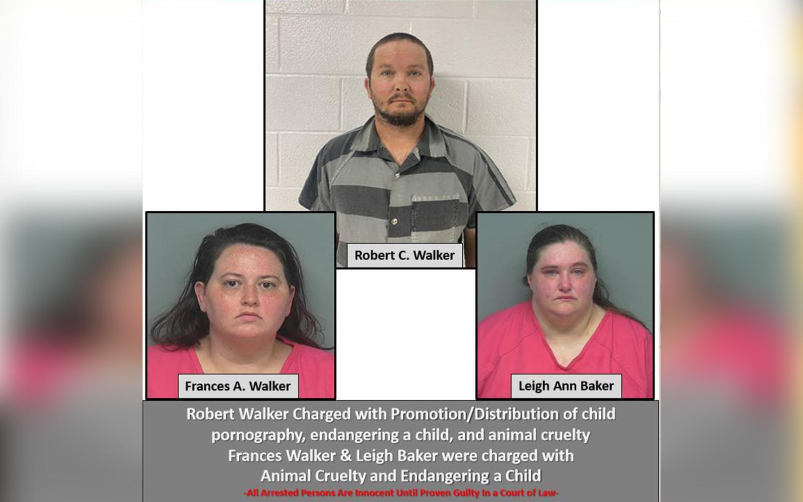Robert Walker was charged with five counts of promotion/distribution of child pornography, endangering a child, and animal cruelty. Frances Walker and Leigh Baker were charged with animal cruelty and endangering a child. All three subjects were transported to the Montgomery County Jail.