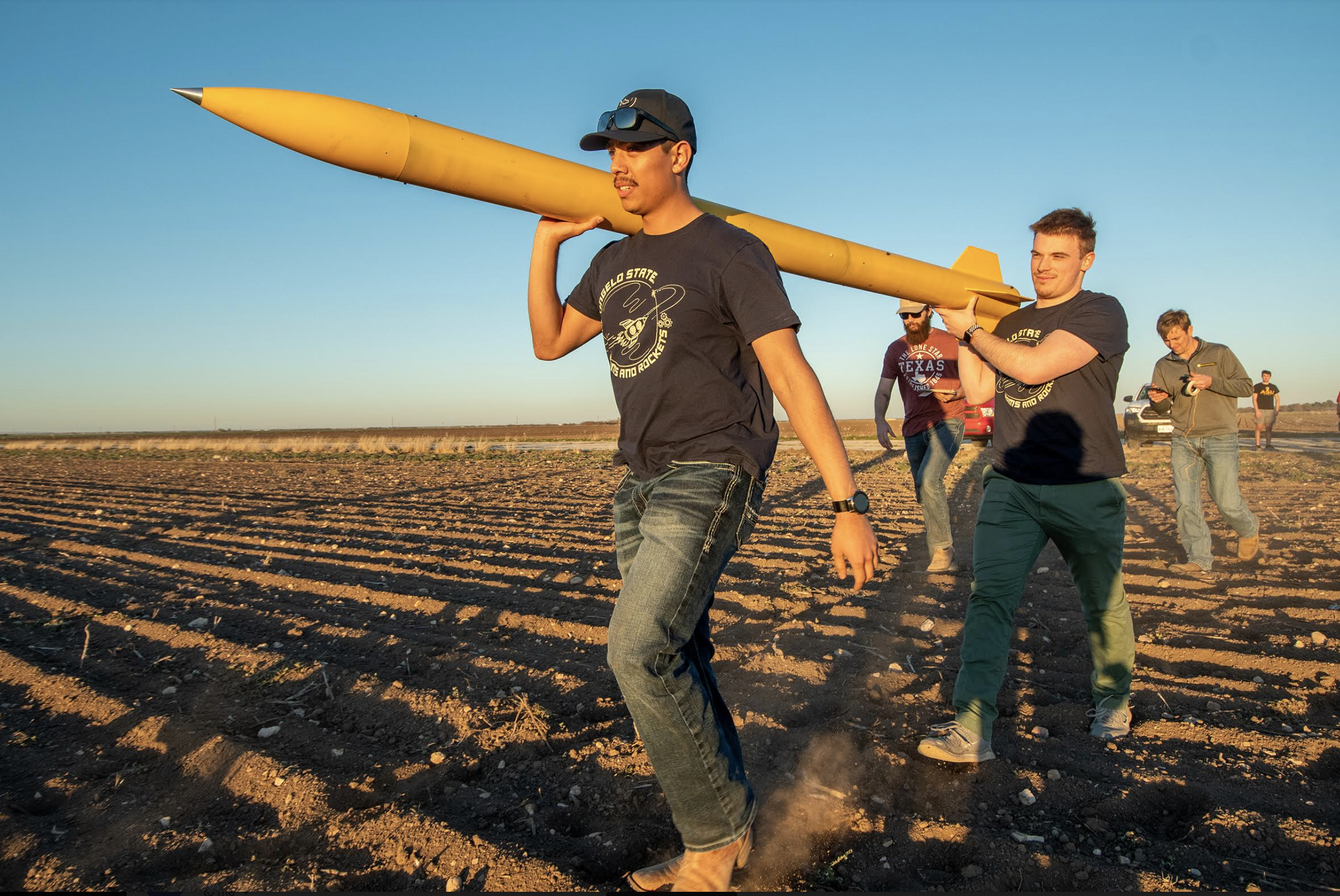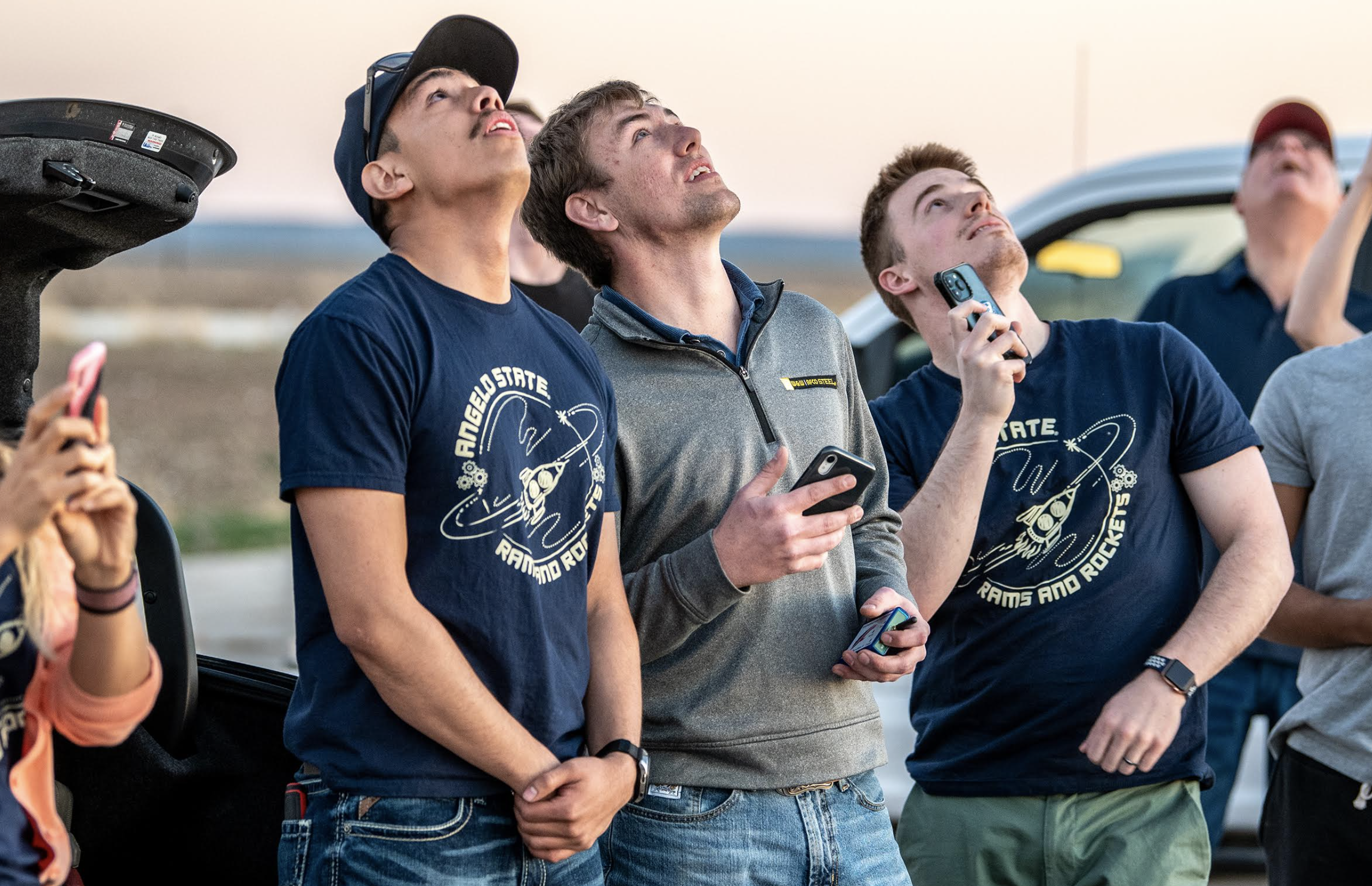SAN ANGELO, TX – Angelo State University’s RAMgineers team of engineering students conducted the first test-fire launch of its full-scale rocket, CandyRam, at Eggemeyer Field south of Wall Monday evening in preparation for a NASA competition.