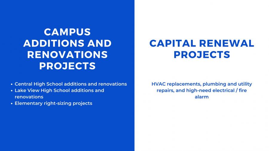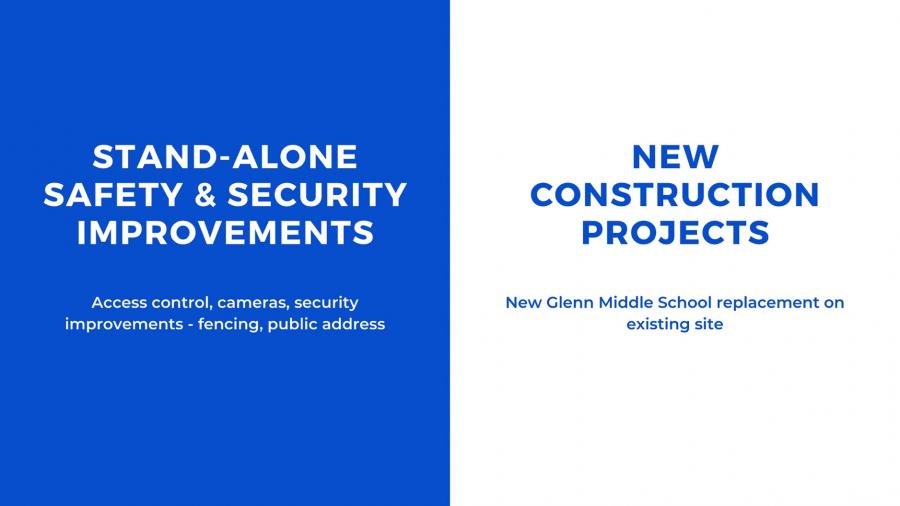 Additional projects include a replacement for Glenn Middle School on its current site and district-wide stand-alone safety improvements such as access control systems, cameras, fencing, and updated public address systems.