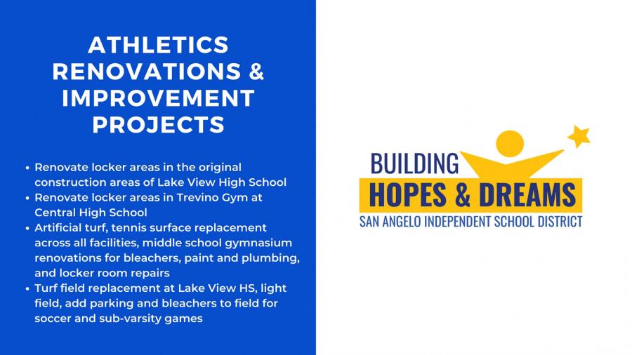 - Athletic Renovations – Enhancing locker rooms, improving gymnasiums, and replacing worn turf and lighting to ensure safety for students and community use.