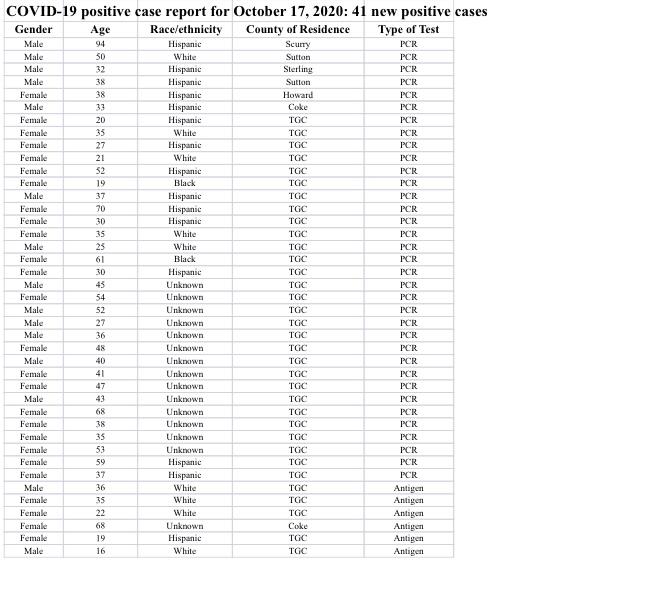 According to the City of San Angelo's Public Information Department, on Oct. 17, Tom Green County currently has 298 cases of COVID-19 after adding 41 new cases today.