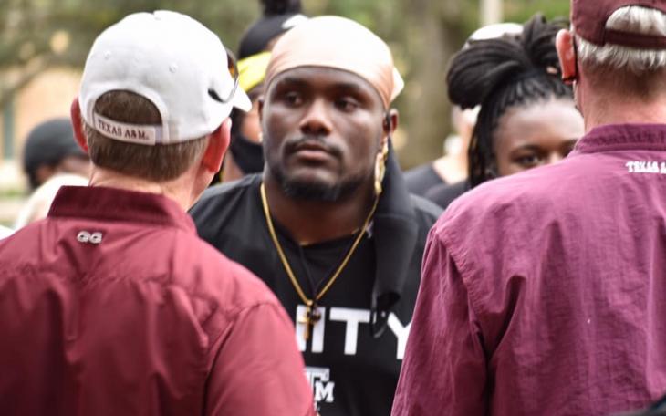 Texas A&M Football Team Members Face Down Old Aggies at Statue