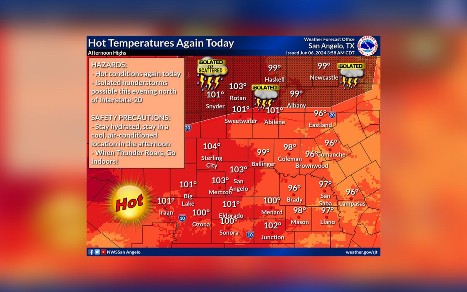 According to the US National Weather Service, temperatures will reach up to 104°F in Sterling City, 103°F in Rotan and San Angelo, and 101°F in Snyder and Sweetwater.