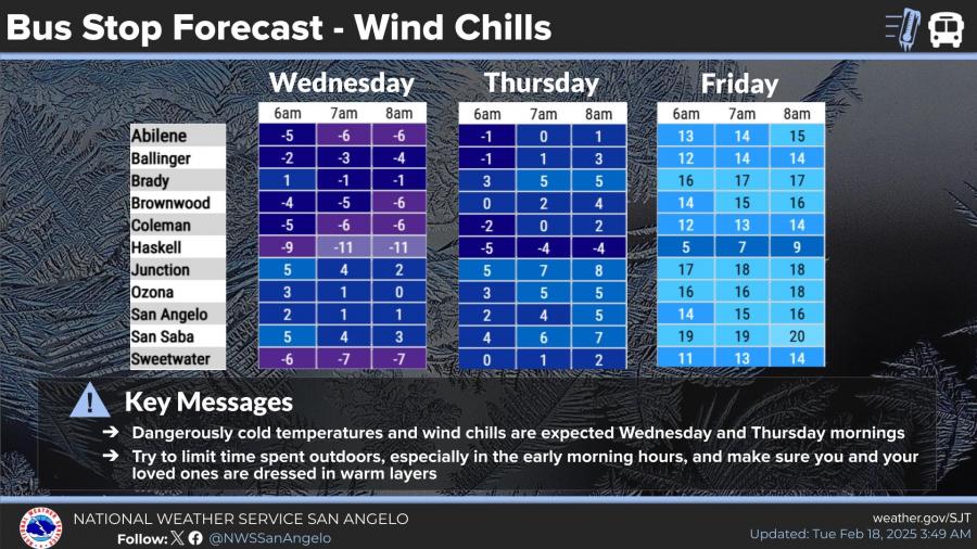 On Wednesday and Thursday mornings, wind chills will be especially dangerous for those waiting at bus stops. San Angelo is forecasted to experience wind chills as low as 1 degree above zero Wednesday morning, with Haskell seeing the lowest at -11 degrees.