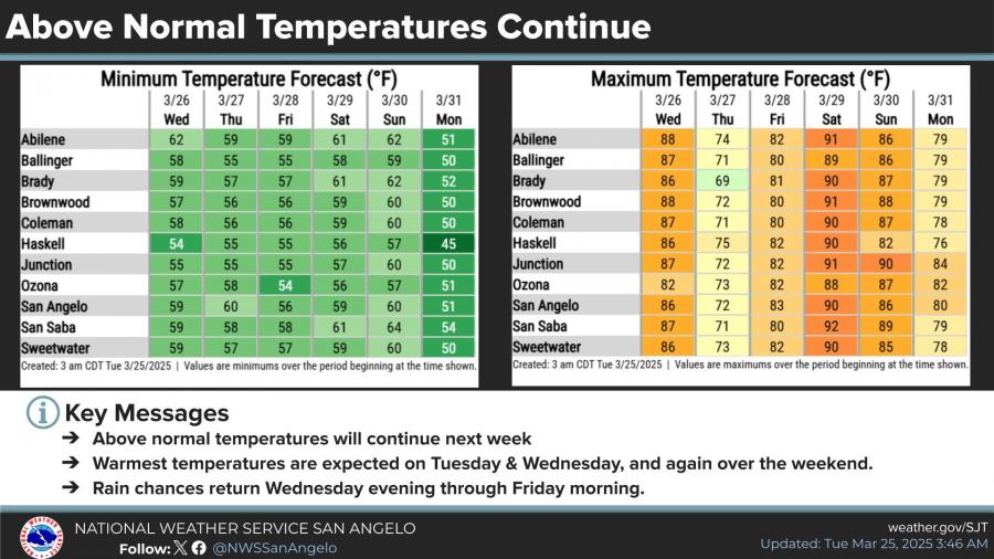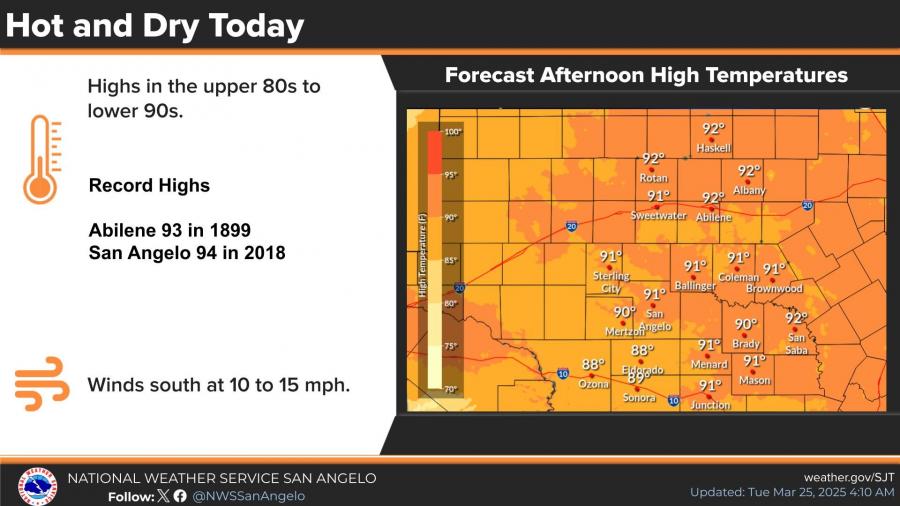 Meanwhile, above-average temperatures will continue through the weekend. Highs are expected to reach the upper 80s and lower 90s Tuesday and Wednesday, with another warmup into the weekend. San Angelo’s forecast high Tuesday is 91 degrees, just shy of the March 25 record of 94 set in 2018.