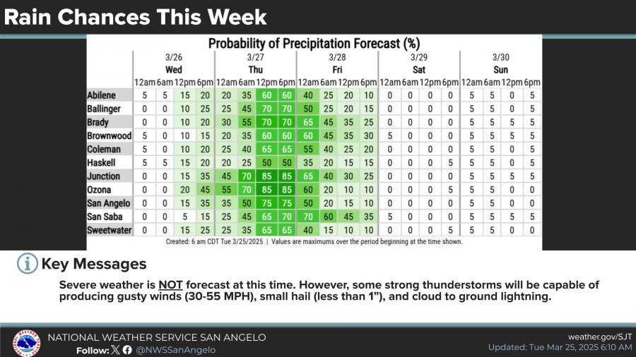 SAN ANGELO, TX – West Central Texas will see increased chances for rain and thunderstorms from Wednesday evening through Friday, according to the National Weather Service in San Angelo.