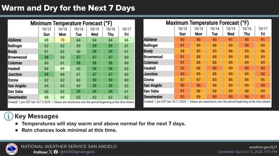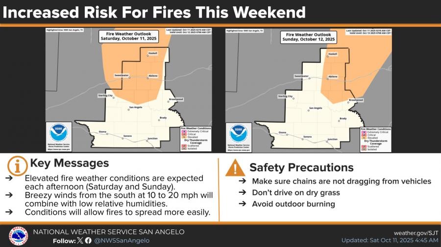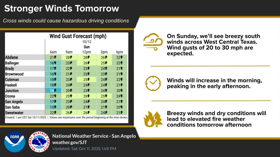 Forecasters said winds will strengthen Sunday morning and peak in the early afternoon, combining with low humidity and warm temperatures to create elevated fire weather conditions. Areas north of San Angelo, including Abilene, Sweetwater, and Brownwood, remain under an elevated fire weather outlook for both Saturday and Sunday.