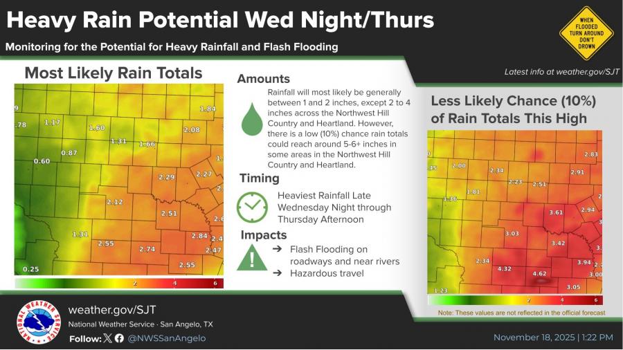 Additional rainfall projections show 1 to 2 inches likely across much of West Central Texas, with a 10% chance that some spots in the Northwest Hill Country and Heartland could reach 5 to 6 inches or more under a worst-case scenario.