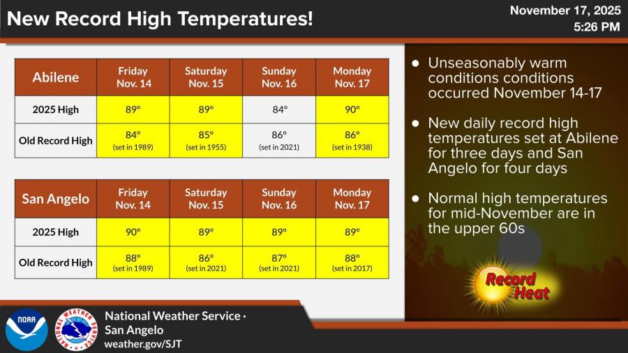 San Angelo set new record highs all four days, reaching 90 degrees on Friday and 89 degrees Saturday through Monday. Abilene set new record highs on three of the four days, topping out at 89 degrees Friday and Saturday before reaching 90 degrees Monday.