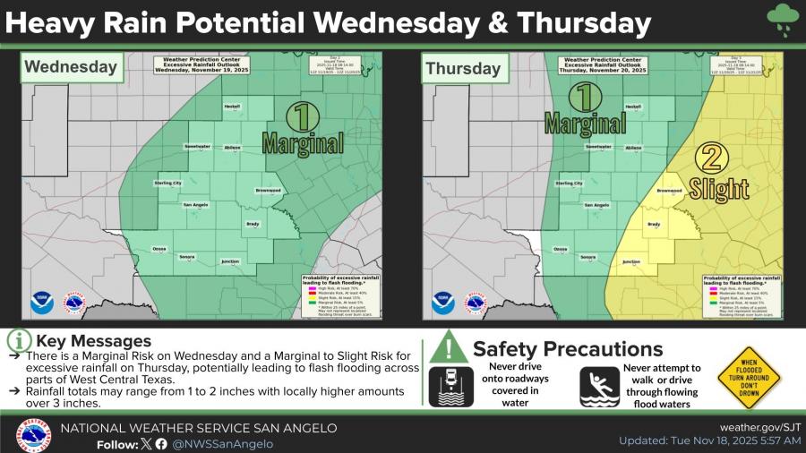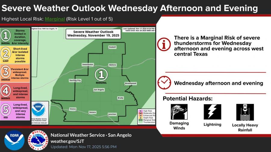 Forecasters say the pattern will shift midweek as a disturbance increases rain and storm chances. A Marginal Risk for severe thunderstorms is in place Wednesday afternoon and evening across west central Texas. Hazards may include lightning, isolated damaging wind gusts and locally heavy rainfall.