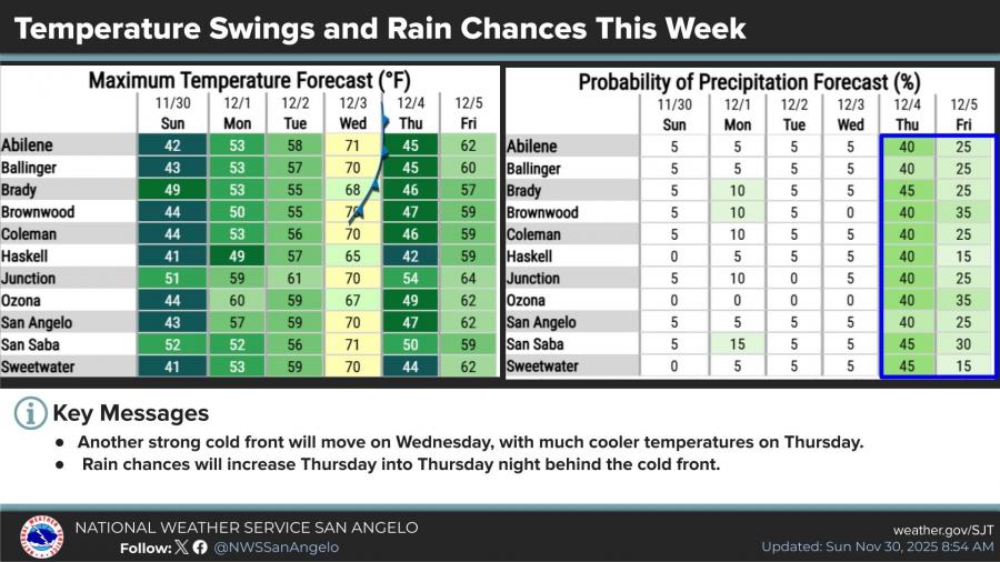 A warmup is expected by Wednesday, when highs climb near 70 degrees ahead of the next cold front. The front is projected to move through late Wednesday or Wednesday night, dropping Thursday’s high into the upper 40s for San Angelo.