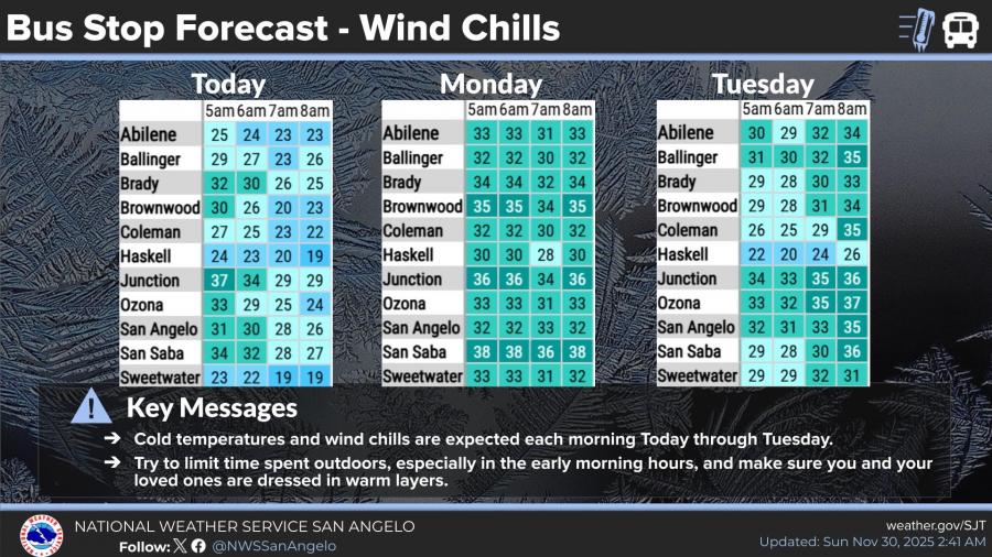 Temperatures on Sunday and Monday remain well below normal, with forecast wind chills at sunrise ranging from the upper teens to low 30s across the region. San Angelo’s morning wind chills are expected to stay in the upper 20s to near 30 degrees through Tuesday.
