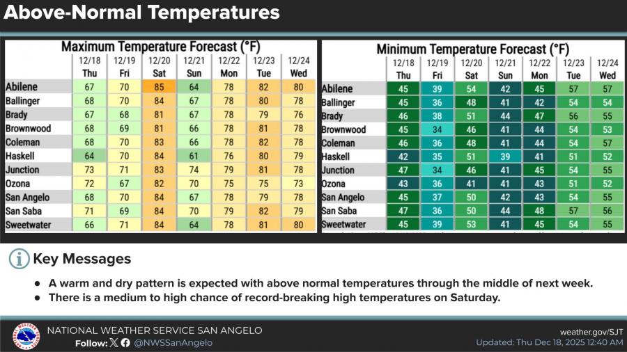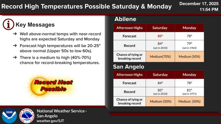 In San Angelo, high temperatures are forecast to reach the mid-80s on Saturday, with a medium chance of tying or breaking daily record highs. Abilene is also forecast to reach the mid-80s Saturday, with a higher chance of setting a new record. Temperatures are expected to remain 20 to 25 degrees above normal through the weekend and into Monday.