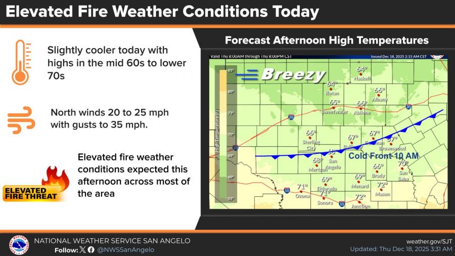 SAN ANGELO, TX — Elevated fire weather conditions are expected across much of West Central Texas on Thursday as strong north winds and low humidity follow a cold front moving through the region, according to the National Weather Service in San Angelo.