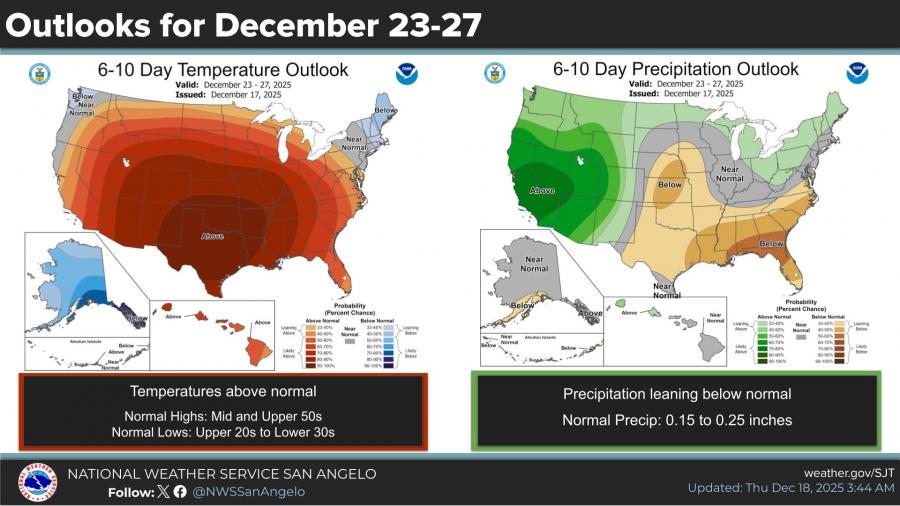 Looking ahead, the six- to 10-day outlook shows temperatures continuing to trend above normal from Dec. 23 through Dec. 27, while precipitation is expected to remain below normal. Normal highs for this time of year are in the mid to upper 50s, with normal lows in the upper 20s to lower 30s.