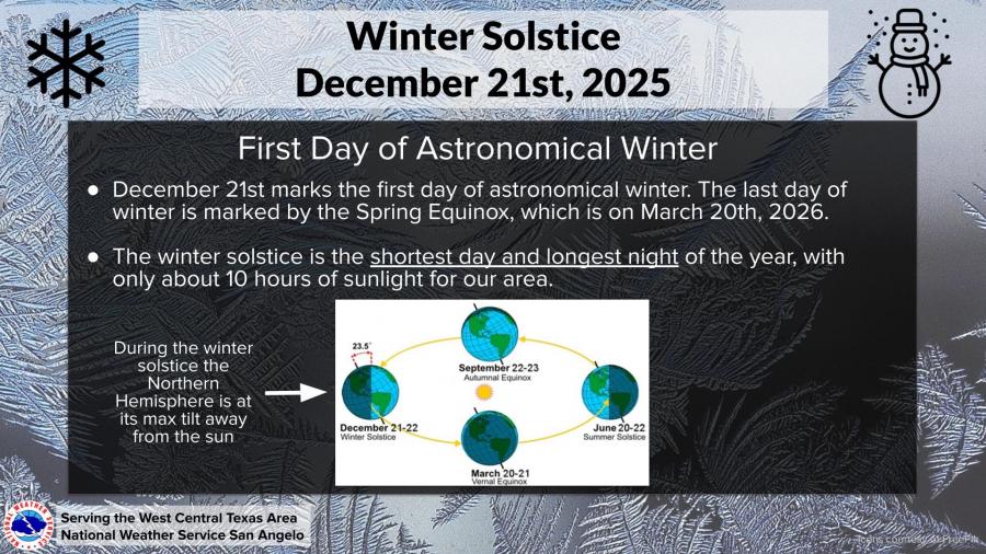 Sunday, Dec. 21, marks the winter solstice and the first day of astronomical winter. It will be the shortest day of the year, with about 10 hours of daylight across West Central Texas.