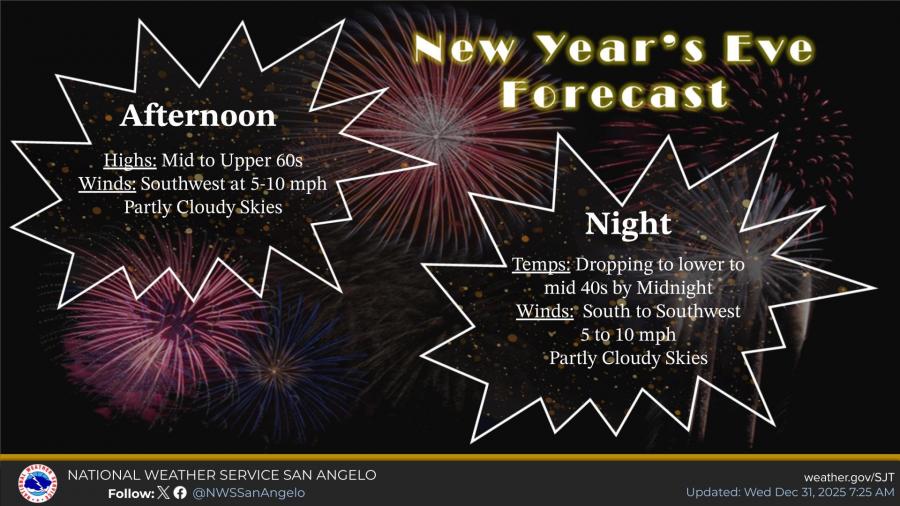 SAN ANGELO, TX — Mild and dry weather is expected across San Angelo and much of West Texas on New Year’s Eve, with afternoon highs climbing into the mid to upper 60s before temperatures fall into the lower to mid 40s by midnight, according to the National Weather Service.