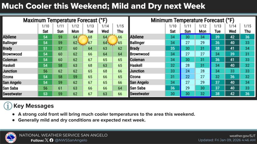A strong cold front arriving this weekend will bring sharply cooler air to the region. In San Angelo, Saturday’s high is forecast at 54 degrees with a morning low of 34. Sunday will see a high near 59 and a low of 27, followed by a Monday high of 62 and a low of 29.