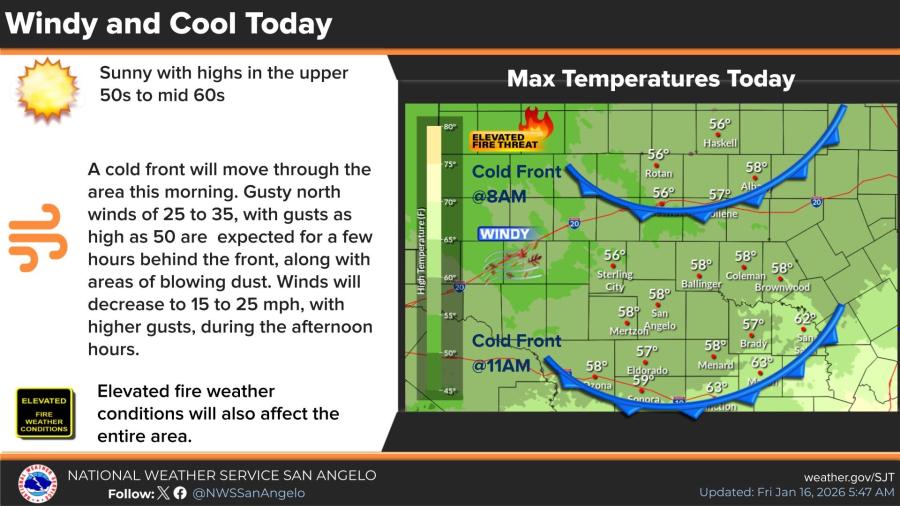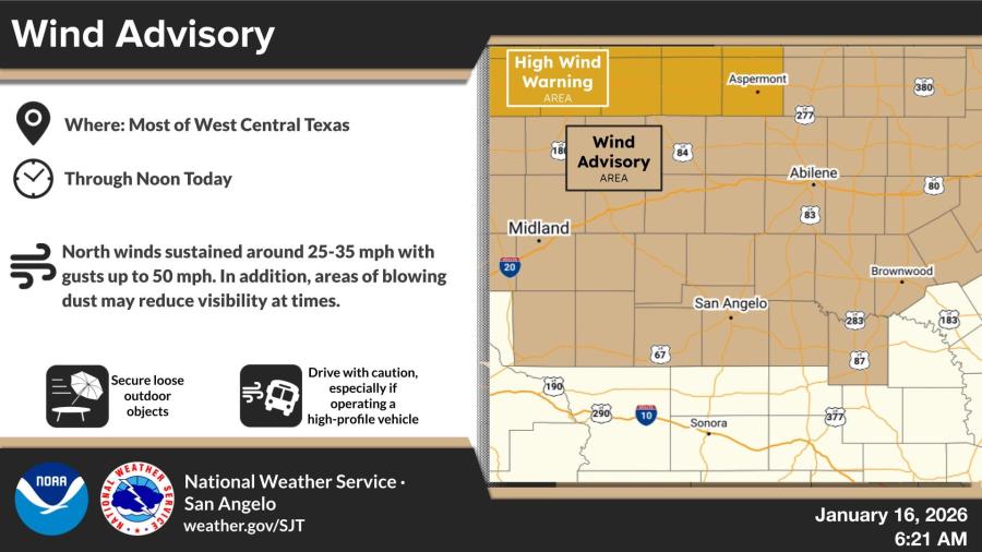 The National Weather Service in San Angelo issued the advisory early Friday, warning of sustained north winds of 25 to 35 mph with gusts up to 50 mph. Areas of blowing dust could reduce visibility at times. Motorists, especially those in high-profile vehicles, are urged to drive with caution, and residents should secure loose outdoor objects.