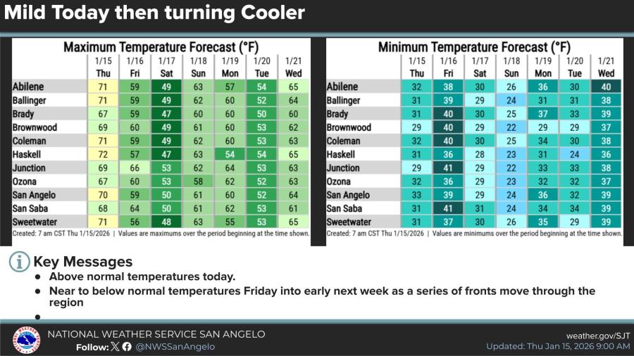 SAN ANGELO, TX — A wind advisory remains in effect until noon Friday for most of West Central Texas, including the Big Country, Concho Valley, and Heartland areas, as a cold front brings gusty north winds and potential blowing dust.