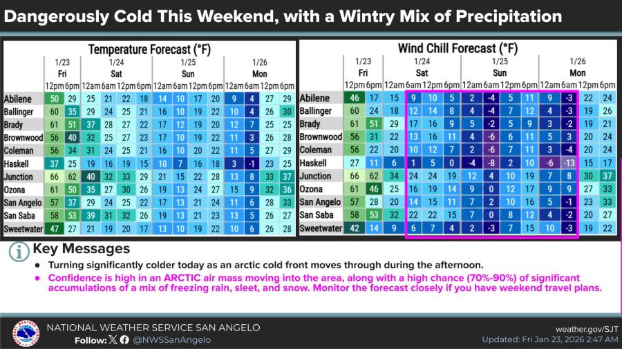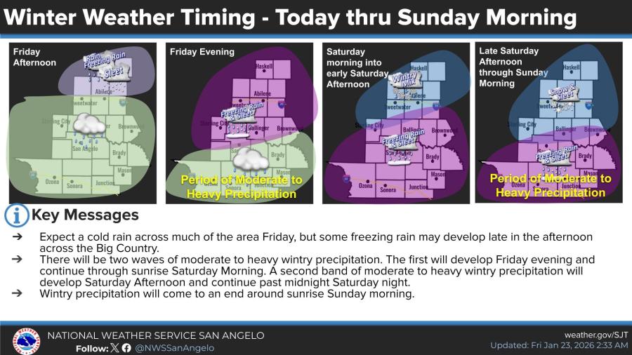 SAN ANGELO, TX — West Central Texas faces two distinct waves of moderate to heavy wintry precipitation this weekend as an Arctic front pushes through the region, the National Weather Service in San Angelo forecast Friday morning.