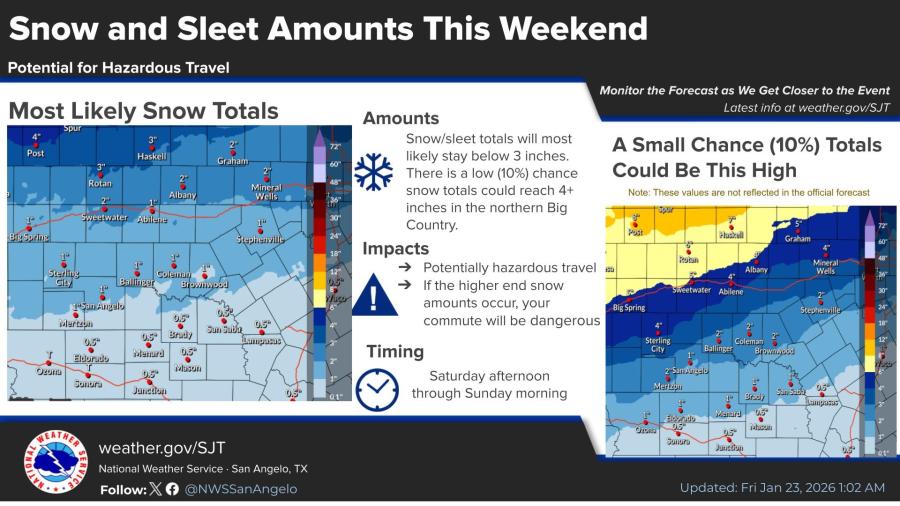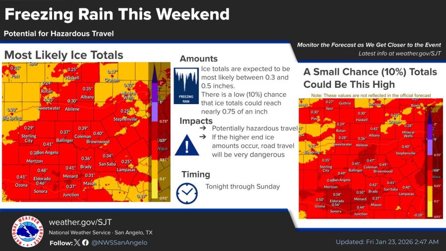 Snow and sleet totals will most likely stay below 3 inches, though northern portions of the Big Country have a low (10%) chance of 4 inches or more. Ice accumulations from freezing rain are expected to range between 0.3 and 0.5 inches, with a low (10%) chance of nearly 0.75 inches in some areas. Higher-end amounts could create hazardous travel conditions.